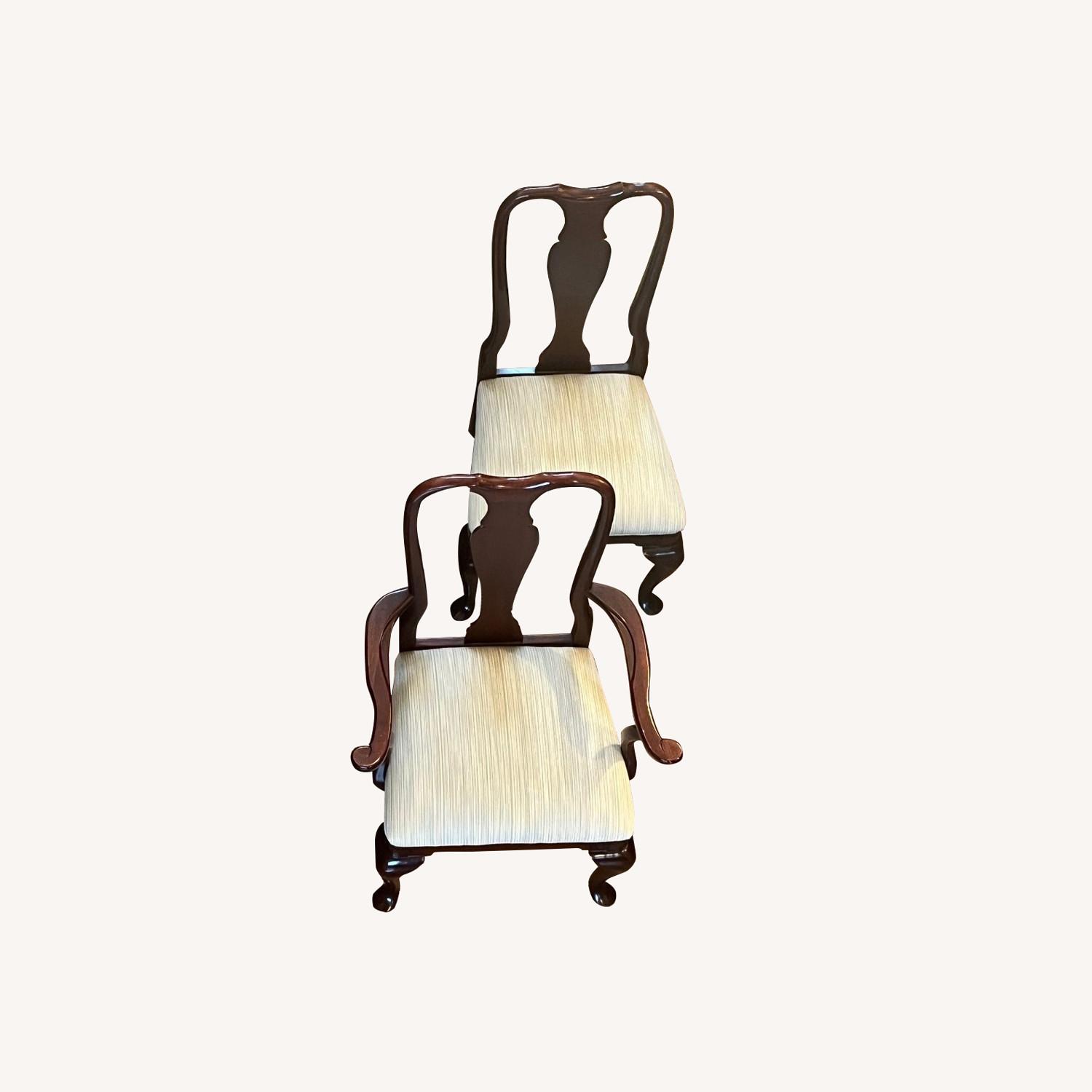 Seller's Notes:Set of 8 Mahogany Queen Anne Style Chairs made in North Carolina. 6 side chairs and 2 arm chairs. Gently used. In great condition with no structural problems. Newly upholstered seats in Sunbrella fabric are stain-free.