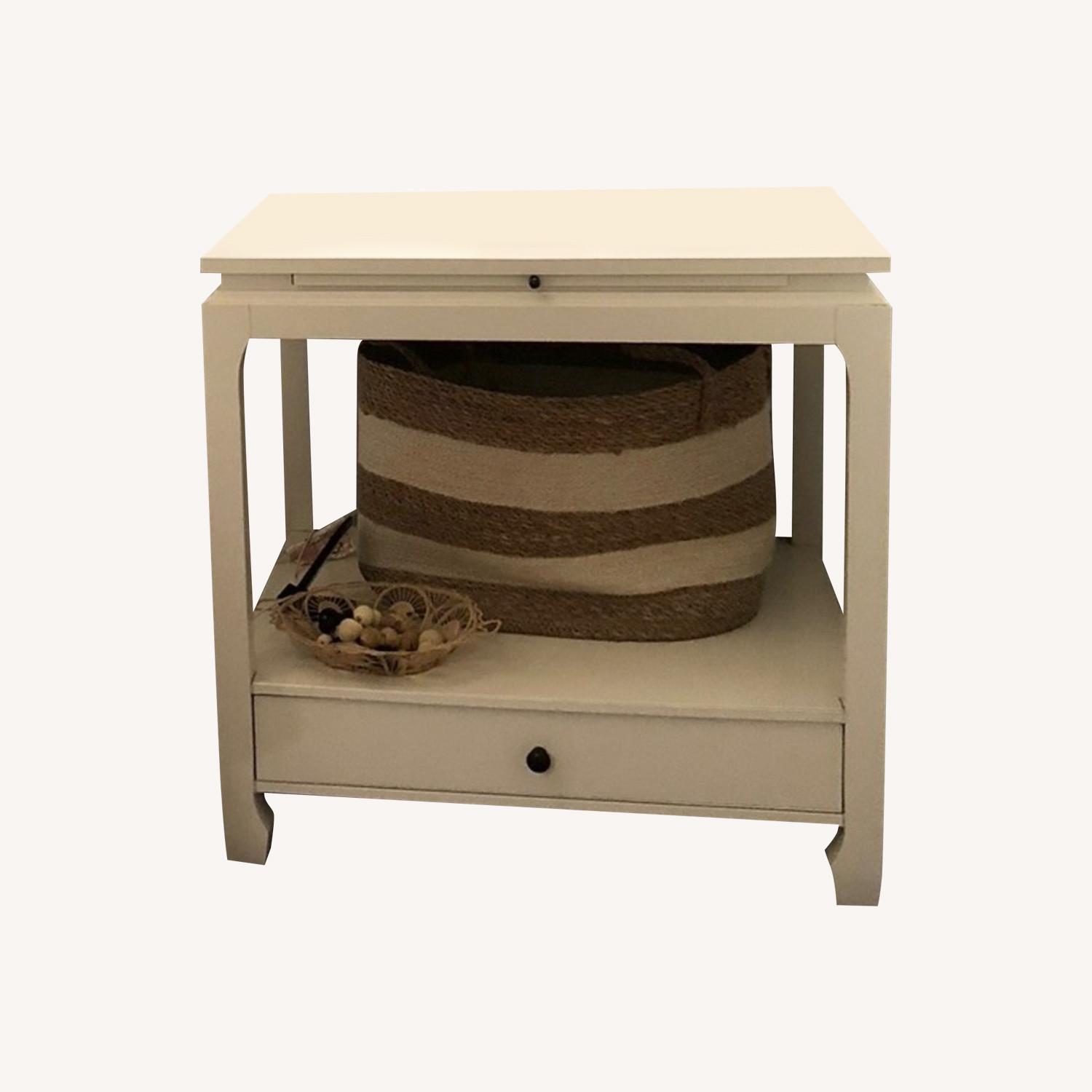 Seller's Notes:Gently used, so minor scratches on table top. The recessed apron and subtle Asian-inspired feet give our Sophie Side Table a worldly sophistication. A shelf tucked beneath the top pulls out to hold a drink or book. Drawer beneath features hidden storage and an interior rich stained finish exposing the natural beauty of the wood grain. Versatile style is perfect anywhere from your bedroom, office or living room. Sophie Side Table features: Dovetailed drawer construction Antique brass finish knob pulls Overall: 27 1/2"H X 27"W X 23"D Pull Out Surface: 19 1/2"W X 8"D Shelf: 16 1/2"H X 26 5/8"W X 22 1/2"D Drawer: 2 1/8"H X 22 1/4"W X 16 3/4"D Construction: Handmade of Mahogany and Beech wood, engineered hardwood & Mahogany veneer.