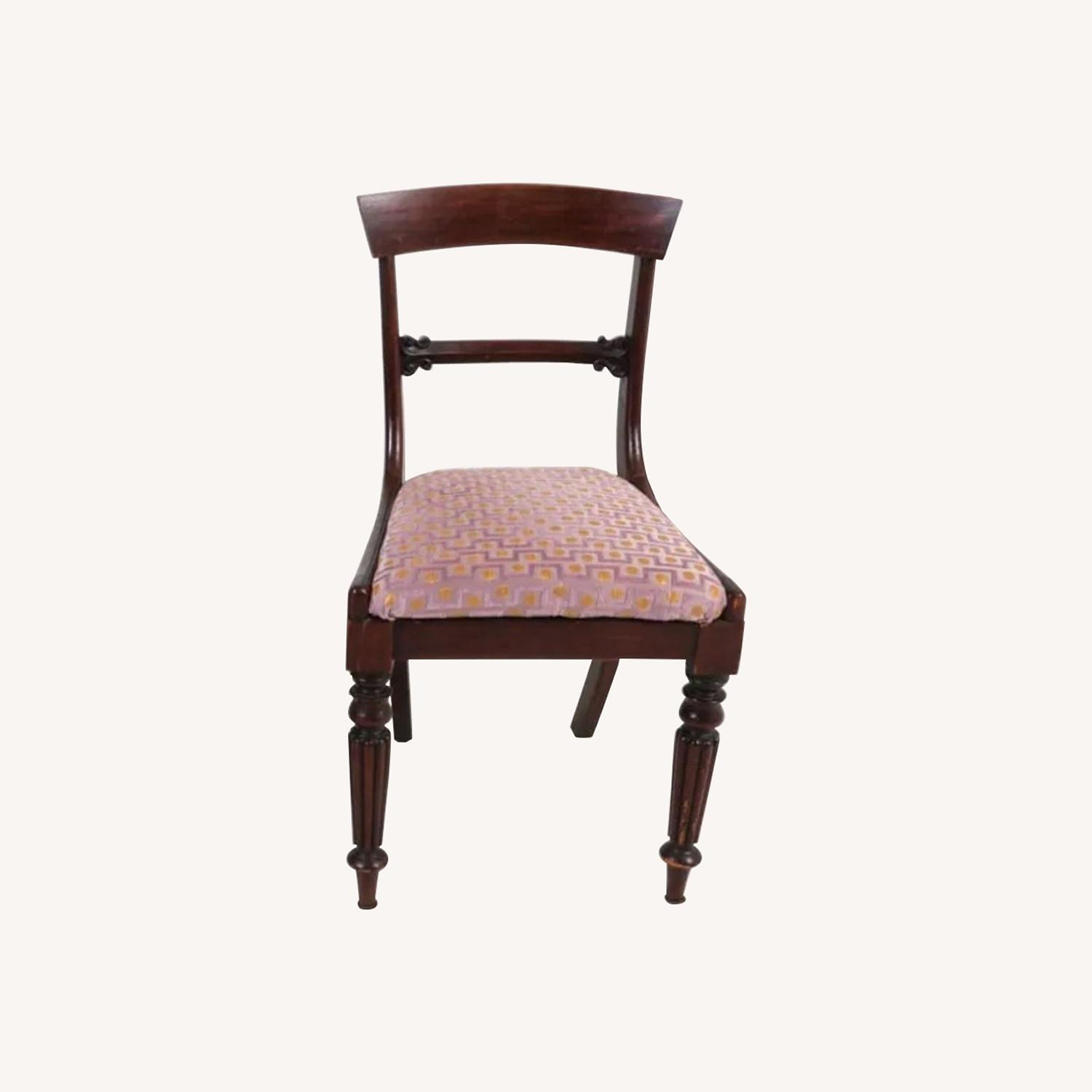Seller's Notes:SET OF FOUR ANTIQUE REGENCY MAHOGANY DINING CHAIRS. Recently reupholstered in Cowtan & Tout fabric. Carved front legs. Cushions reupholstered. Circa 19th Century. Dimensions: H 33.5" x W 18" x D 19" Seat height: 18" Condition: Moderate scuffs, nicks and rubbing on edges. Wear consistent with age and use.