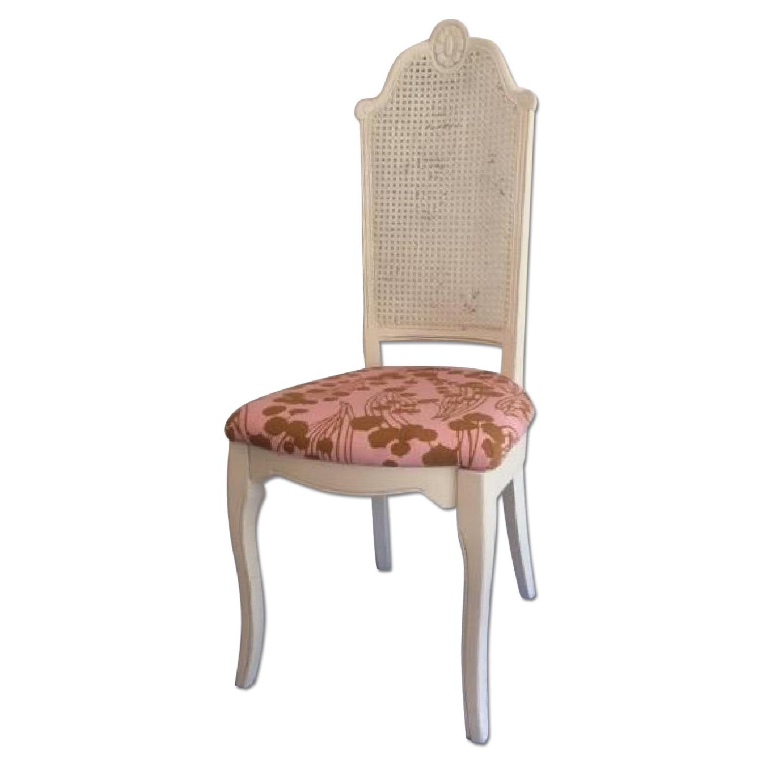 Seller's Notes:Shabby Chic vintage accent chair. Recently Upholstered with Amy Butler Fabric from her Forest line (Seed Pods in pink). Has minor wear and tear to white paint on the woven back. Superficial/cosmetic damage to chair back - was repaired and primed, but never painted. Minor sun bleaching to fabric (Very subtle - I am only noticing now that I'm inspecting it.) I have used in the the corner of my bedroom, but I believe was originally a dining room chair. I would keep this but I no longer have the perfect corner for it.