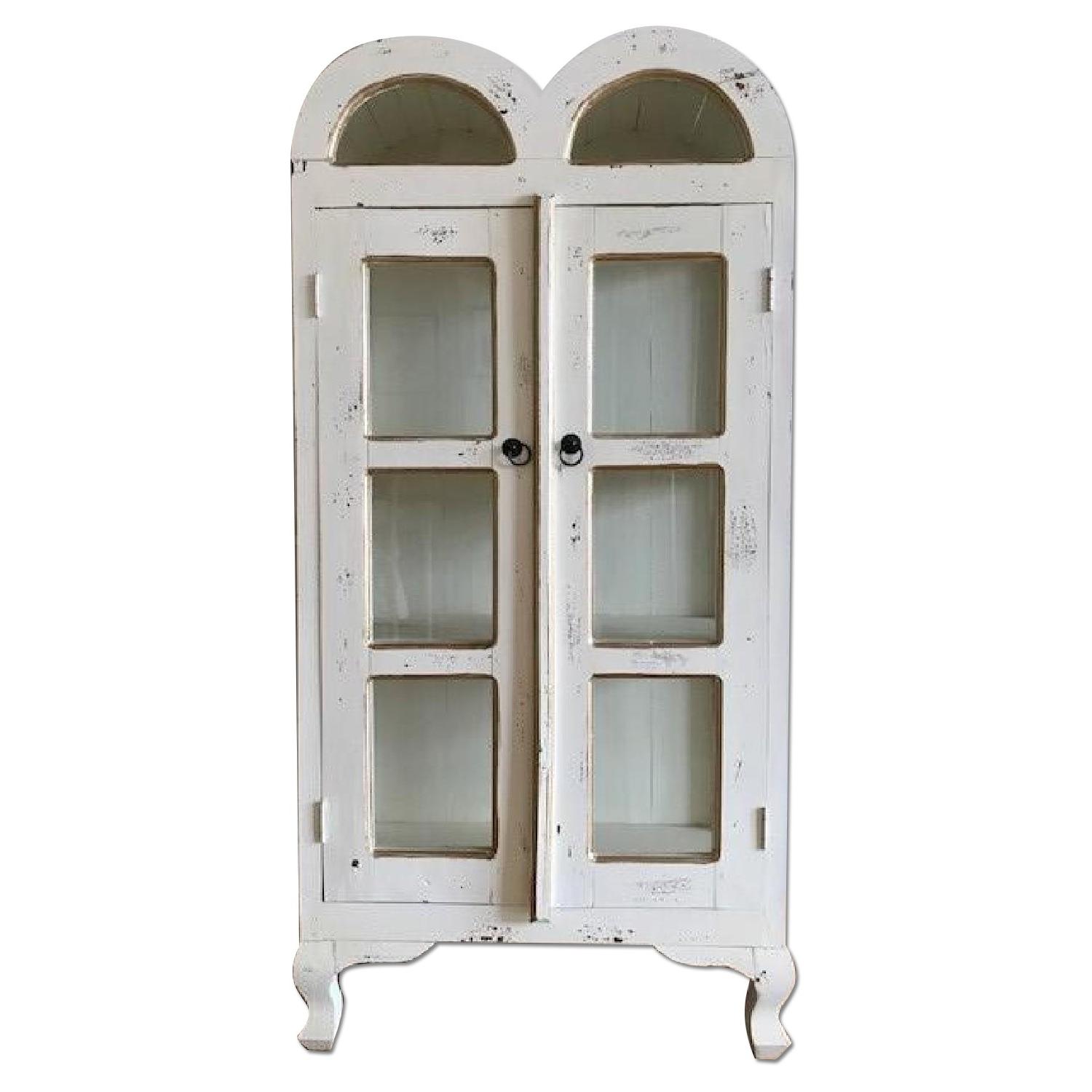 Seller's Notes:Antique "shabby chic" bookshelf in cream color painted wood with gold details. Windows panes each accented with gold detail and double arched top. Doors open to three shelves, ideal for books, trinkets, plates, or anything else you want to show off. Purchased at an antique dealer in Westchester County. Intentional distressing done to paint, but no other signs of wear.