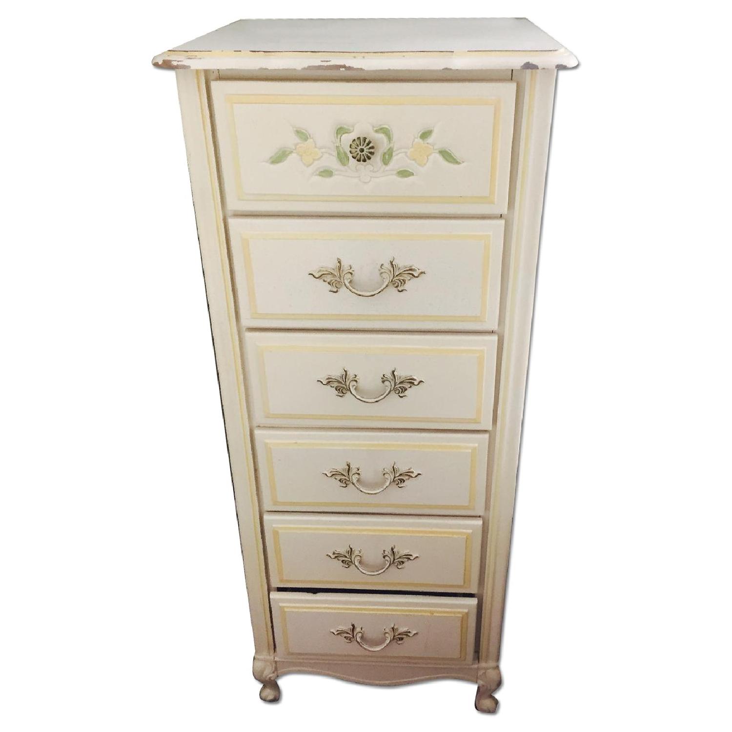 Seller's Notes:Adorable shabby chic. All the charm of shabby chic in a more practical 6 drawer tall dresser. Perfect for the corner of your favorite room. Drawers are deep but slide well with modern hardware. Details include beveled curved edges, carved feet, flowers inlays, antique knobs and hand painted details. Originally purchased for 599.00 at an antique store in the Berkshires 2 years ago. This quaint dresser will surprise you as how much it can hold.. Dimensions are 18 deep, 22'wide 53 tall