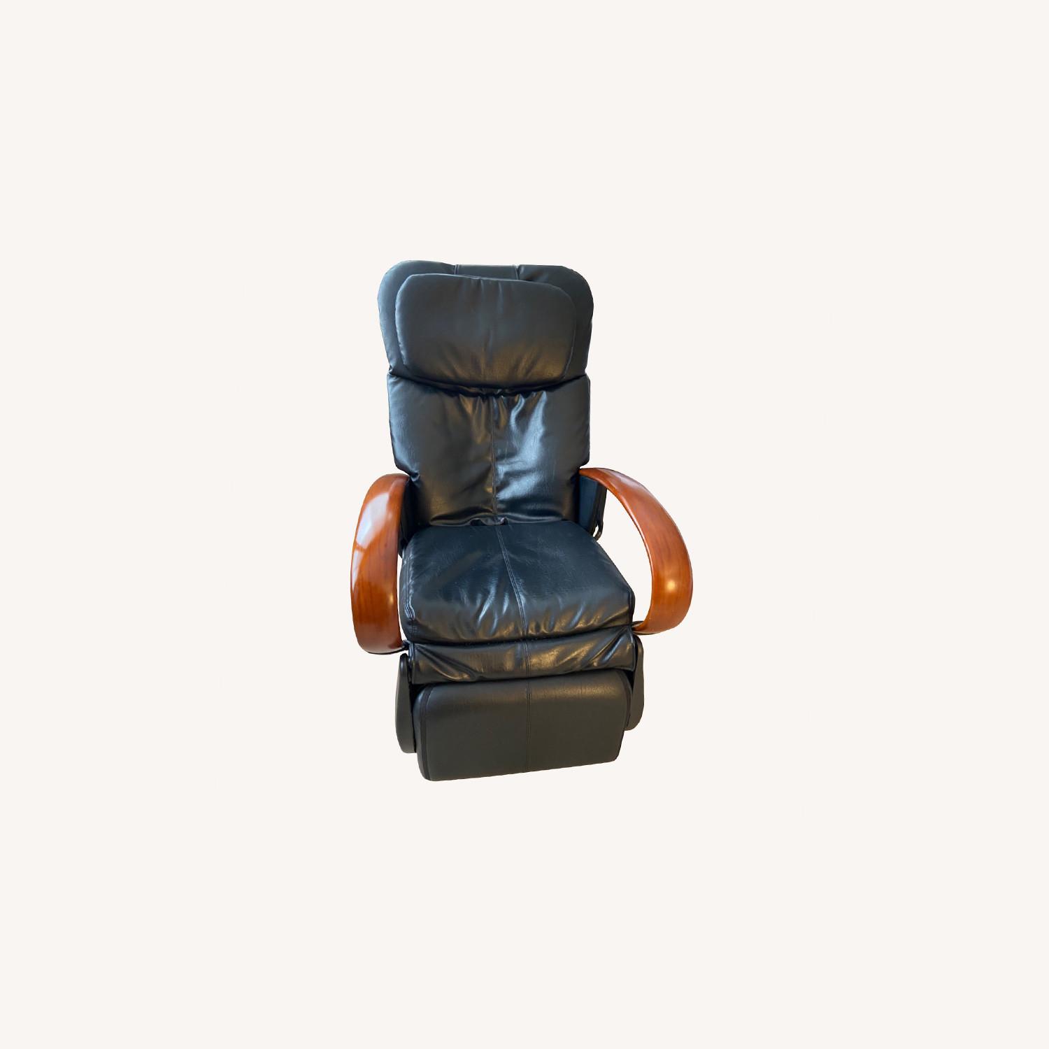 Seller's Notes:The worlds most comfortable chair, originally over $3000. Massaging recliner chair by sharper image. Has rollers that traverse up and down your spine, or can pound, tap, knead, massage or cajole your spine into relaxation. The foot rest can be reversed to engage the additional foot and calf massager. Deep cherry colored wood arms with a black leather seat/ back/ body. Has a side pocket for storage or your favorite reading material. Corded handheld control. Small seam tear where the seat and back meet- easily repairable and pictured. Some small scratches on the arms. Lovingly broken in and so so comfortable!