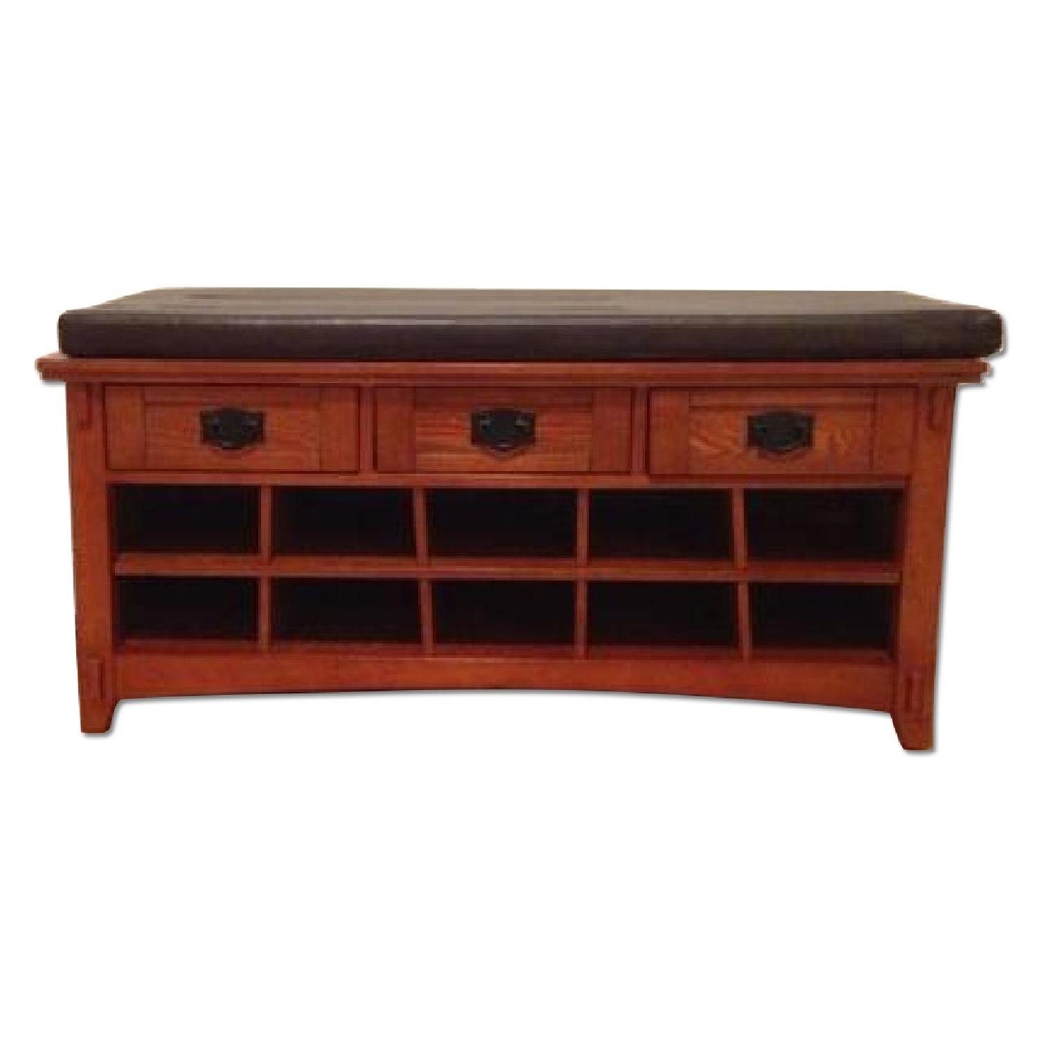 Seller's Notes:Shelf/bench with shoe storage. Removable top cushion. Retail $400. 3.5 ft in length. 1.5 ft in height. And 1 ft 4 inches deep.