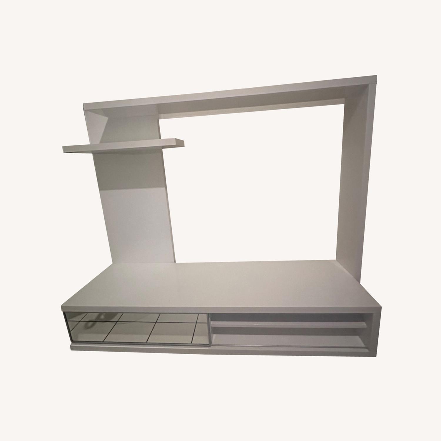 Seller's Notes:Sleek white entertainment center featuring upper and side shelves, mirrored sliding doors, and open storage compartments. Perfect for TVs, décor, and media organization.