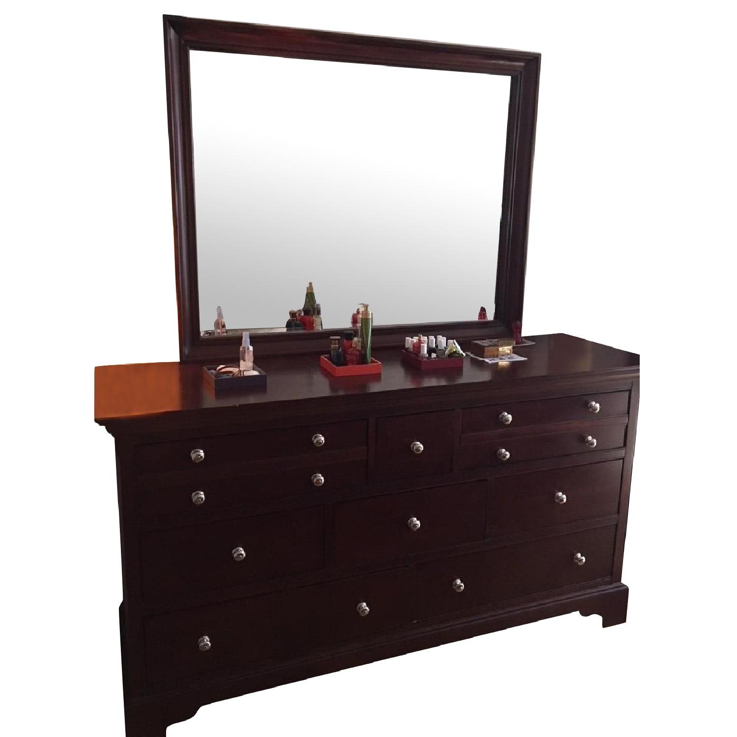 Seller's Notes:Shermag Bourbon Street Bedroom Furniture Collection. Wood with cherry finish. Originally purchased from Macy's Home Furniture Store. 10 years old, but only 6 years of use, as it was in storage for 4 years. Minor wear and tear (scratches only); still in very good condition. 8-drawer dresser with mirror. Mirror dimensions are 39.75 inches tall x 49.5 inches wide.