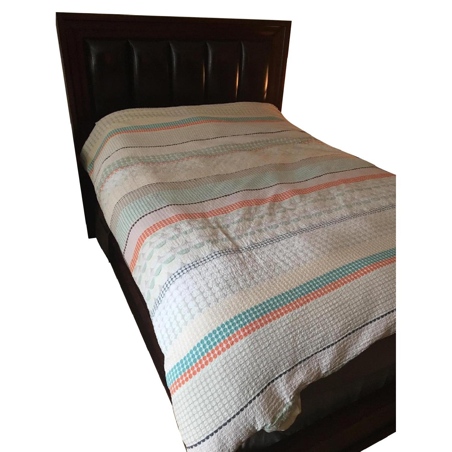 Seller's Notes:Shermag Bourbon Street Bedroom Furniture Collection. Wood with cherry finish. Originally purchased from Macy's Home Furniture Store. 10 years old, but only 6 years of use, as it was in storage for 4 years. Full-size wooden bed frame with dark brown/ black leather headboard.