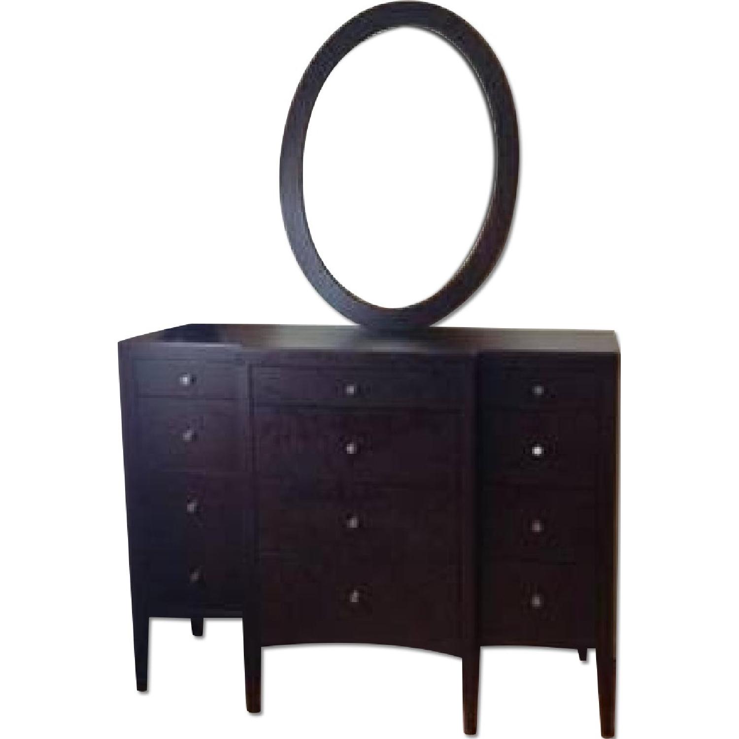 Seller's Notes:Amazing Designer Dresser & Mirror Combo Beautiful Shermag dark coffee colored solid wood dresser and oval mirror. Purchased for over $2000. Unique design with sleek and elegant details. Silver-tone hardware. In great condition. A similar dresser is still available online for $1119.
