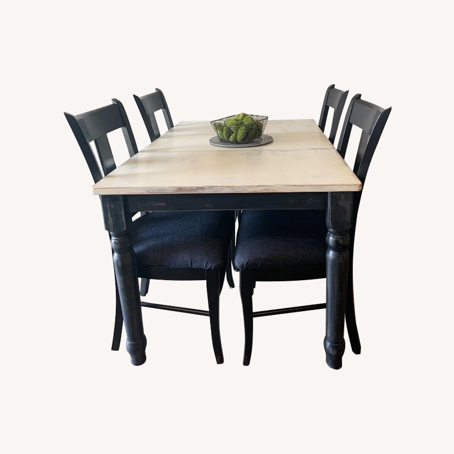 Seller's Notes:Table and two leaves. 8 oversized padded chairs. Chairs are black rubbed finish as for table legs same. Table top is creamy distressed finish.