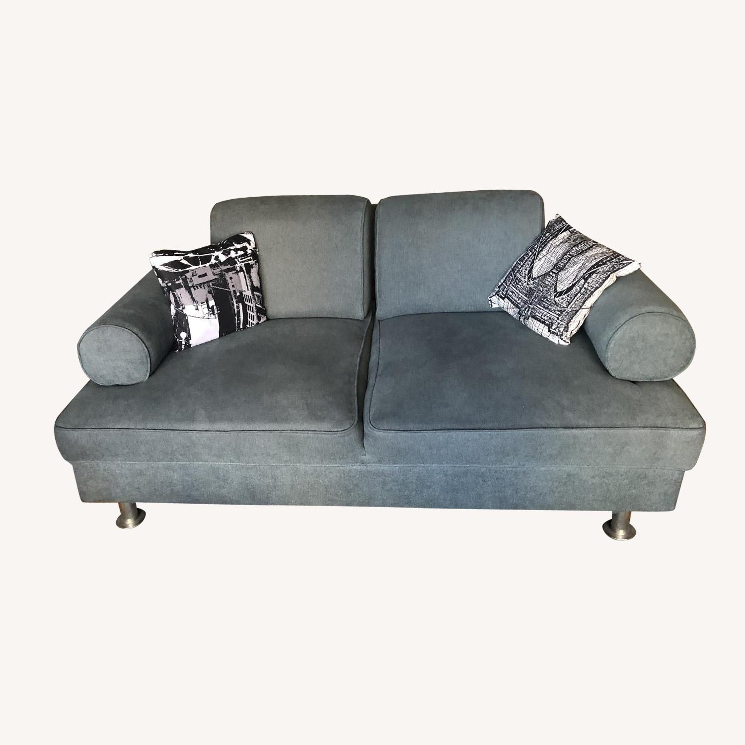 Seller's Notes:Shermag Sofa - Back and Sides can be removed and then it can be used as an extra twin bed. In great shape. About 15 years old but I had it recovered 2 years ago in a blue-grey microsuede. Storage Ottoman 51” X 19” X 17” (H)