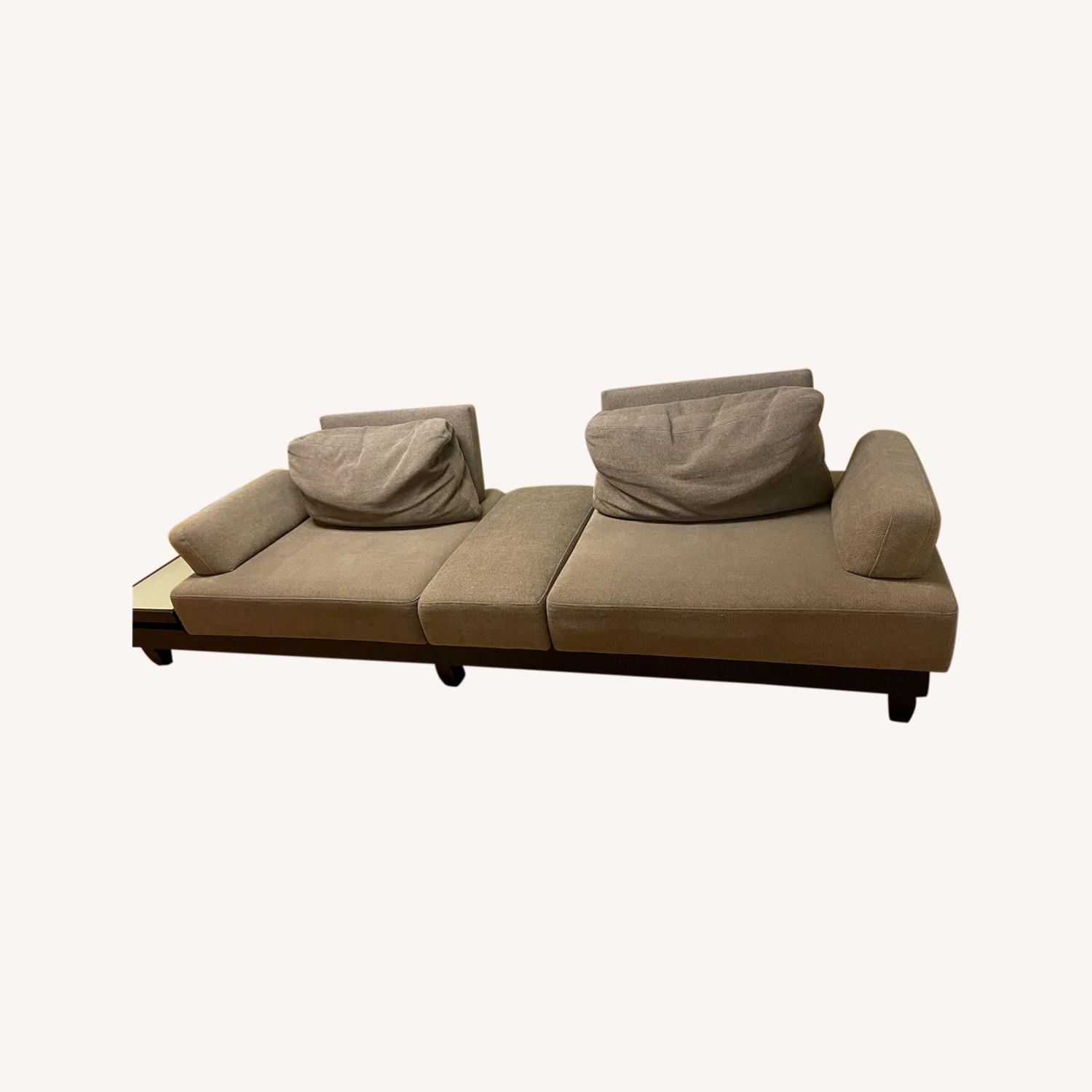 Seller's Notes:The brilliant designer Normand Couture, won Canada’s highest distinction for 4 years in a row for his versatile Couture Cameleon Collection. The super high quality sofa was made by Shermag Canada. I believe it's from the 1990s. I bought it from a modern furniture boutique. The back pillows and arm pillows on this sofa can be rearranged. There are multiple ways the sofa can be configured, as there are extra pieces. You can put two glass tables at the ends, or in the middle. You can remove the tables and add a short cushion (see photo of it on shelf) and have a long sofa. You can move the back cushions to one side and have it more of a lounger. It can be set up tete-a-tete if you flip the large cushions around. If you remove the arm and back cushions it can be used as a twin size bed and is firm and comfortable to sleep on. The condition inside and out is very good, with one chip in the glass of one of the tables (can add photo). The neutral color looks good with various configurations of colors. I am not sure what the fabric is. See label that states polyurethane, but I believe this is the cushion material. The sofa is located in a house in Glen Park with one set of stairs until 9/30 and then will be in a garage at ground level. Because of the modular nature it is easy to move. The base is solid, but not super heavy to move. Dimensions are not precise (let me know if you need precise and I'll remeasure).