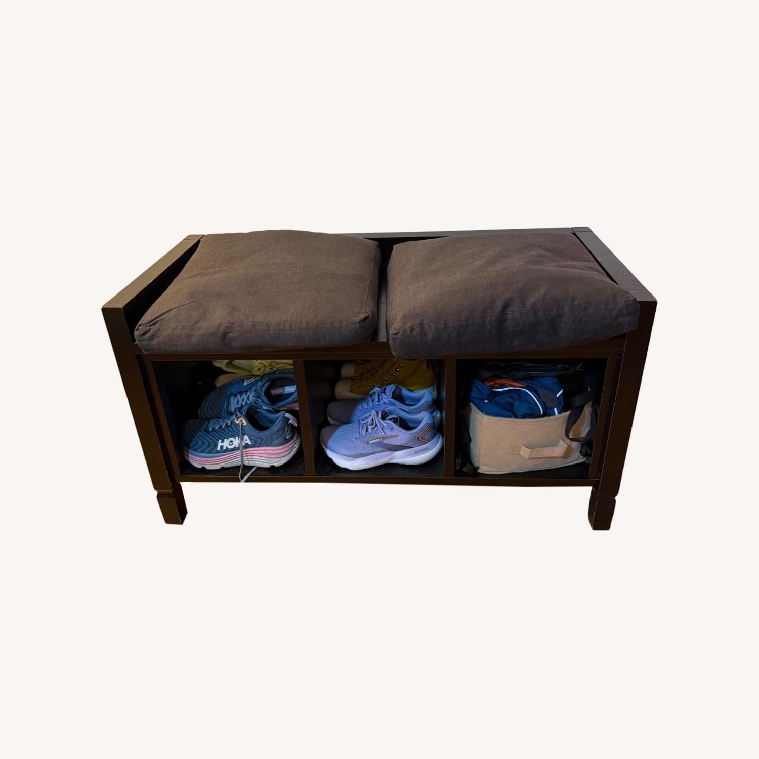 Seller's Notes:This bench is useful and comfortable. We used two slots for shoes and a third for reusable shopping bags. We kept more shoes underneath it too. It worked really well for us at the entrance of the apartment as a spot to put on/take off shoes, and to throw coats on when coming in from the cold, or bags when coming in from grocery shopping. It has a couple of minor dings, but we kept the cushions clean and the piece is super sturdy.