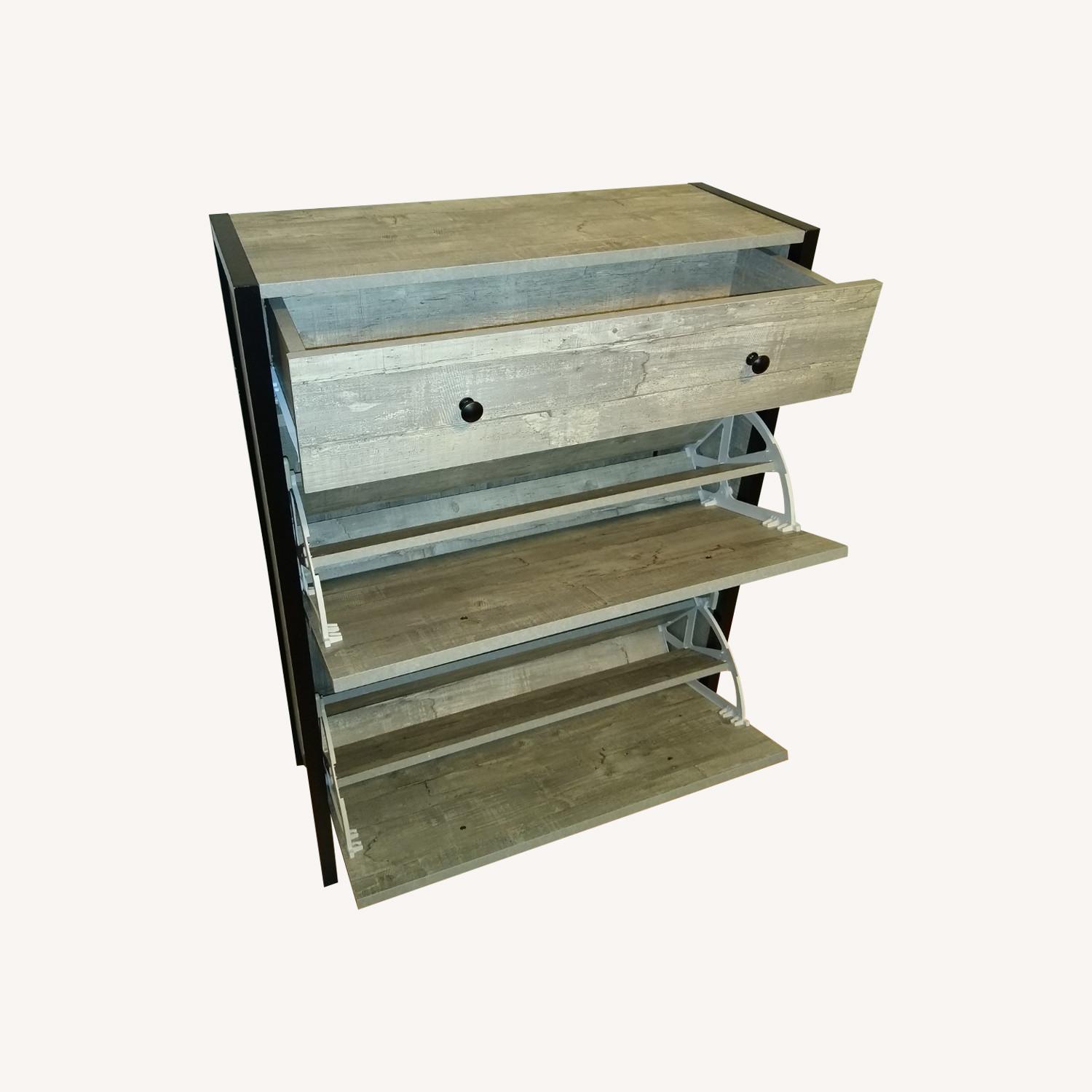 Seller's Notes:Shoe storage cabinet with 2 flaps offer space for up to 8 pairs of shoes and additional drawer provides storage for smaller items. Newly assembled but never been in use. Dimension: 41" H x 30" W x 10"