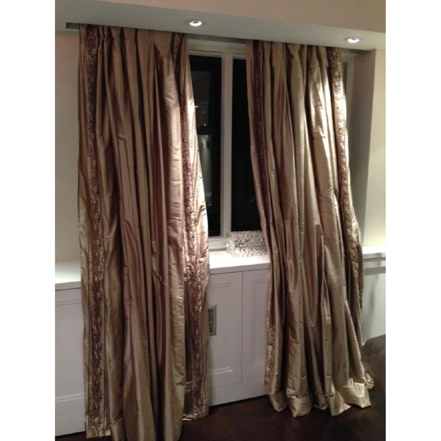Seller's Notes:DESIGNER ELEGANT DRAPERY PANELS (4) BY SILK TRADING COMPANY Duponi SILK- CAROLINA PATTERN. LINED AND INTERLINED. 96 W X 92L. EXCELLENT CONDITION.