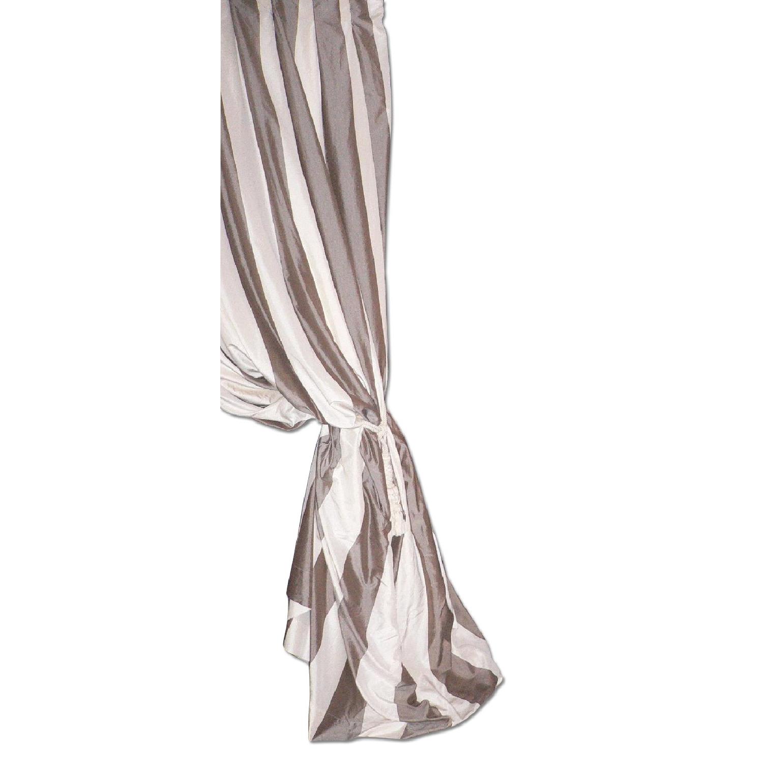Seller's Notes:Gray & Cream wide stripes silk drapes from Silk Trading Company. (1) panel. Bought at ABC Home 7 years ago. Moderate wear. Fully lined. Has great volume when bunched together. Retail: $500.00. No smells. See stains on inside lining. Otherwise no other visible stains. Elegant & chic.