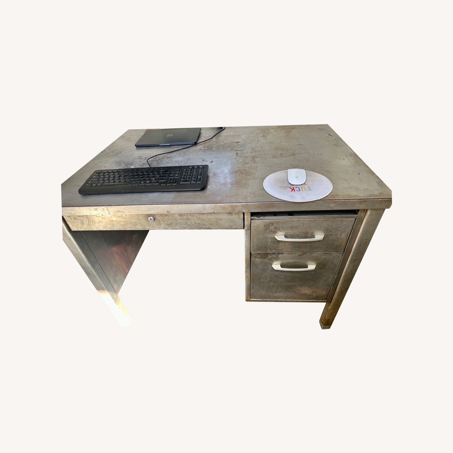 Seller's Notes:Vintage metal industrial style desk. Purchased used. This is a statement piece and a workhorse desk. Very comfortable size. 1 very large pen drawer and 2 other very large drawers to the right of the seated position. There is also a pull out for additional tabletop work space. Endless possibilities to refinish to your desired taste. This desk will stand the test of time (and already has). I love it - but we are moving and it just does not make sense to take it. Hope it finds someone that appreciates its lived in indestructible charm as much as I have. Inside markers indicate: The General Fireproofing Co (Youngstown Ohio) and Velvoleum.
