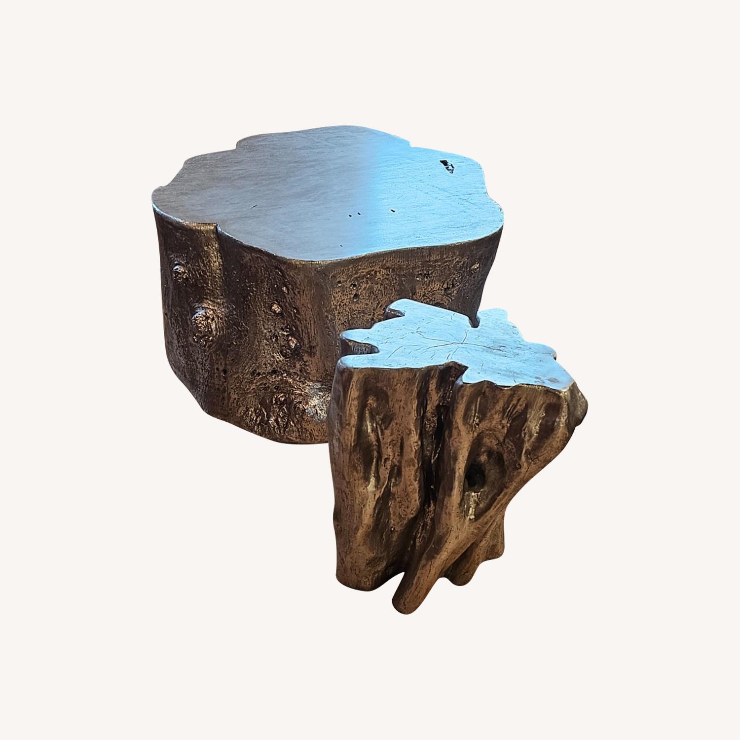 Seller's Notes:Phillips collection log silver leaf/resin coffee table and side stool/table originally purchased from ABC Home. Scuffs on surface from normal wear.