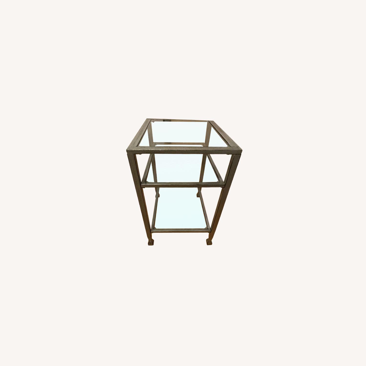 Seller's Notes:Great metal/glass end table perfect size for apartments/smaller spaces. This shelf has lots of storage (2 shelves and a top) with plenty of room for anything you may need it for.