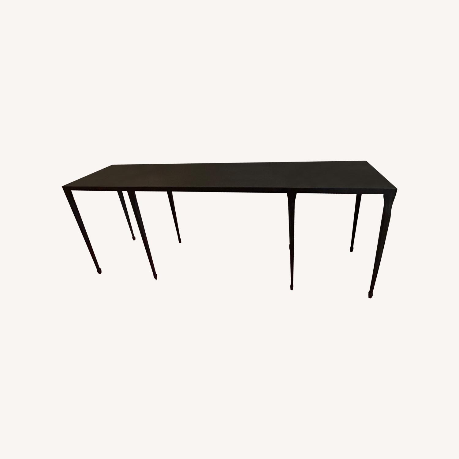 Seller's Notes:Inspired by 20th-century modernist art, Silviano refines the rustic character of cast iron on a grand scale, accented with sculptural detailing and the artisanal appeal of textured metal. Eight attenuated tapered legs of cast iron support the long metal top, expertly finished with a multi-step process. The Silviano Console Table is a Crate and Barrel exclusive.