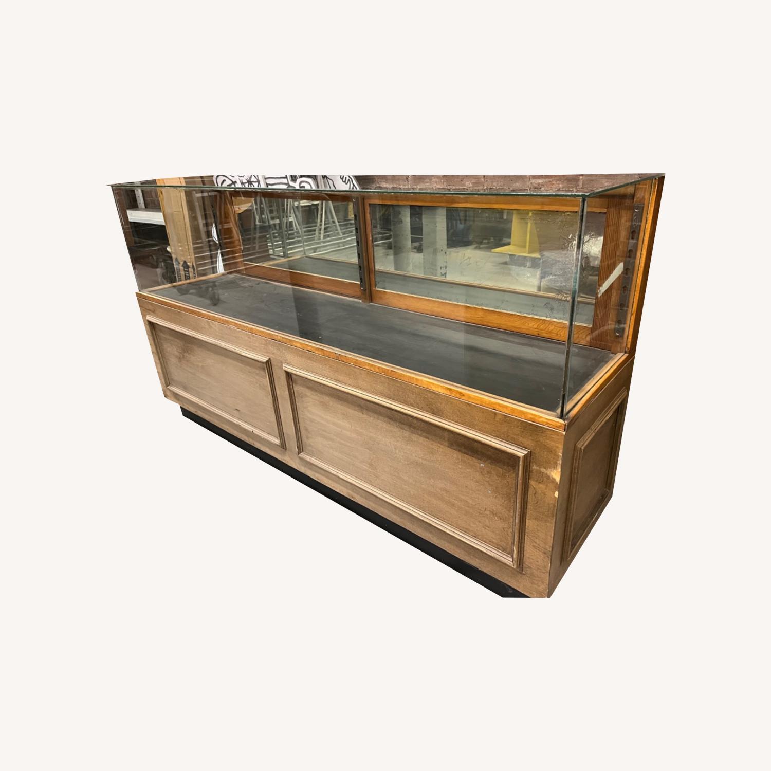 Seller's Notes:Simple Display Case needs TLC to give a new life. But it is sturdy and functional piece. Size: H 38.5" x L 70" x W 18" Display: H 16" x L 68.5" x W 14.5" Storage: H 8" x L 68" x W 16"-17"