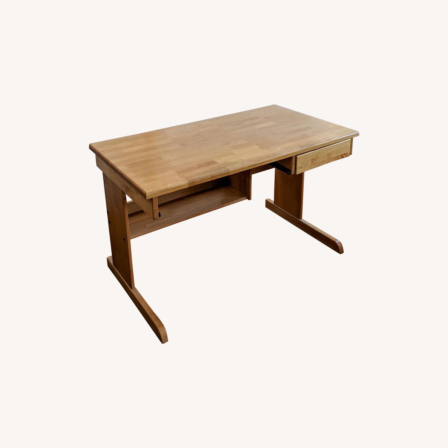 Seller's Notes:Large Durable Oak Wooden Amish-Made Ergonomically Friendly Desk Purchased in Lancaster, Pennsylvania in Amish Country 28"x 48"x 29.5" Lightly Used Solid Quality. Great undershelf/undercarriage storage space perfect for space saving and consolidation. Keyboard pull-out draw not included Only reason I am switching is I want a standing desk.