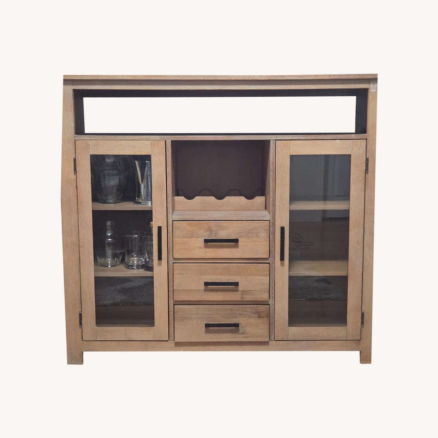 Seller's Notes:Solid wood TV stand with Glass door storage and wine rack.