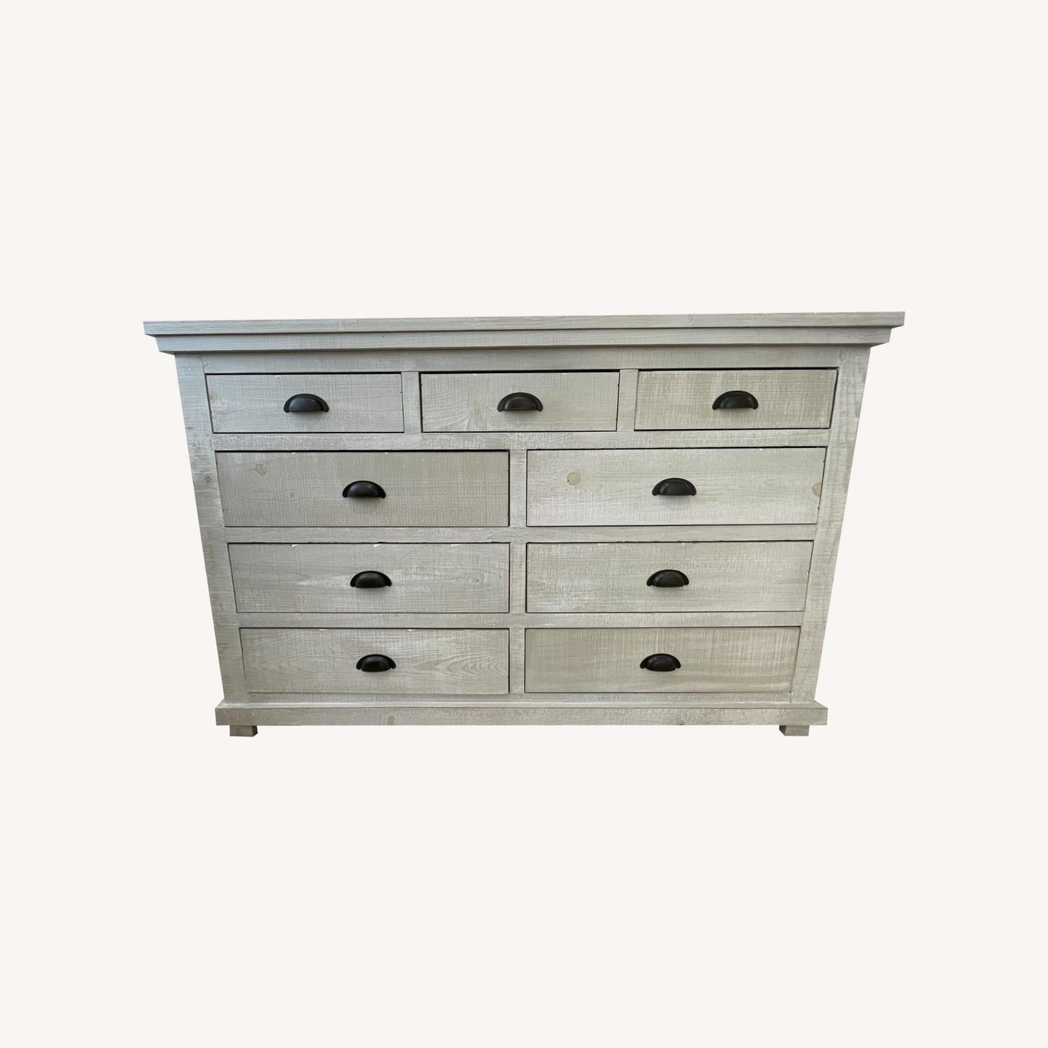 Seller's Notes:Purchased three of these in March 2023, which was one too many. This one has been in our dinning room since then. Barely used. Description from Living Spaces: "Constructed with salvaged solid pine, the design is rough hewn and planed to showcase the wood’s unique characteristics. Then, the wood is decked in a grey chalk finish with hand-applied distressing for a weathered look. To ensure maximum durability, it incorporates tongue and groove construction, solid pine drawer interiors and metal guides. Vintage-inspired bin pulls in a gunmetal finish."