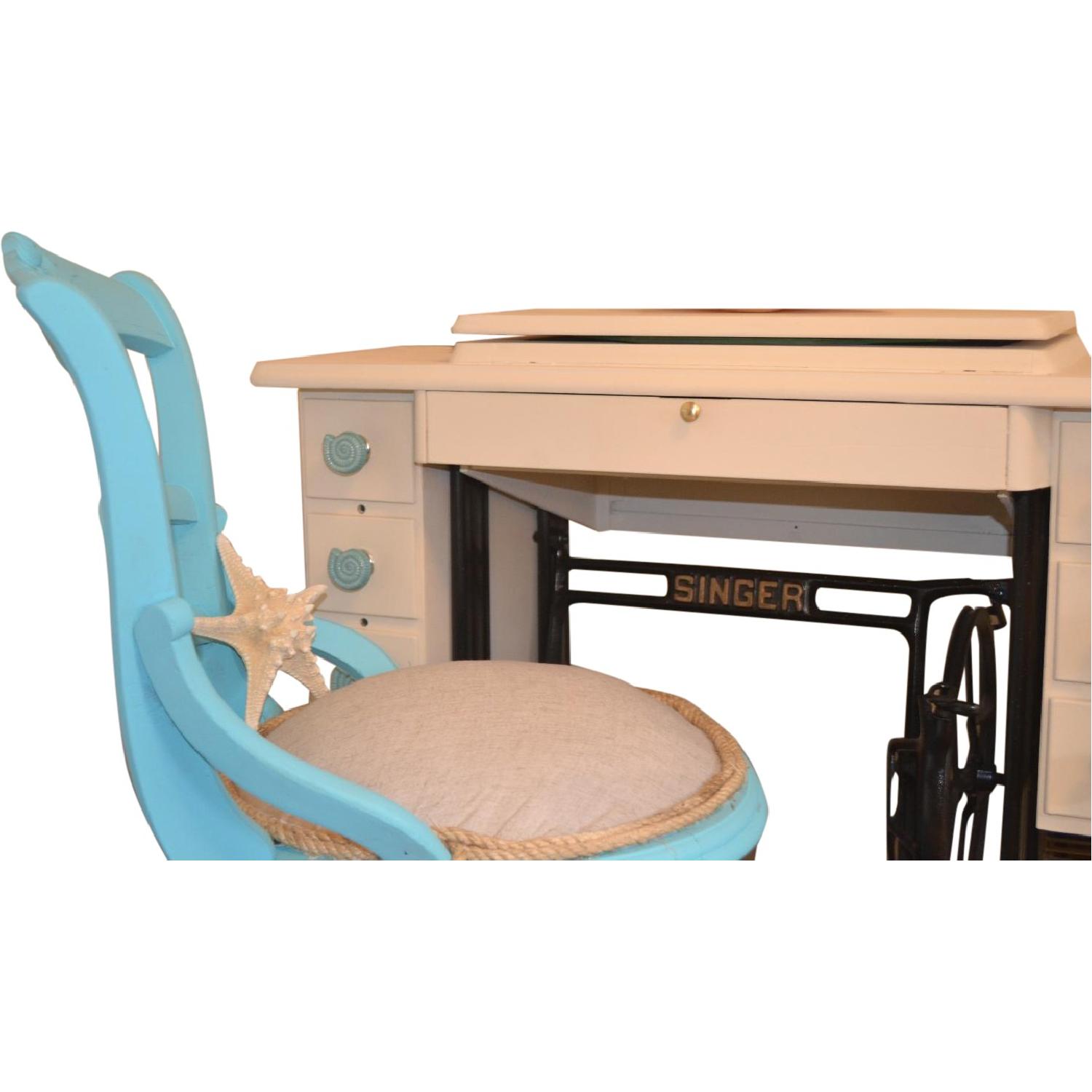 Seller's Notes:This rescued relic has been turned into a makeup vanity and serves as an accent piece to any room. With coastal inspired tones and hardware, this wonderful Singer sewing machine was painted with a textured light cream color, double waxed for extra protection and durability. All six drawers open smoothly, does not have any smells or stains. The cast iron legs are free of rust and there are no signs of wear or damage. The vanity chair is an antique 1920's very sturdy and comfortable. We changed the upholstery completely! HEIGHT: 28" LENGTH: 34" DEPTH: 16"