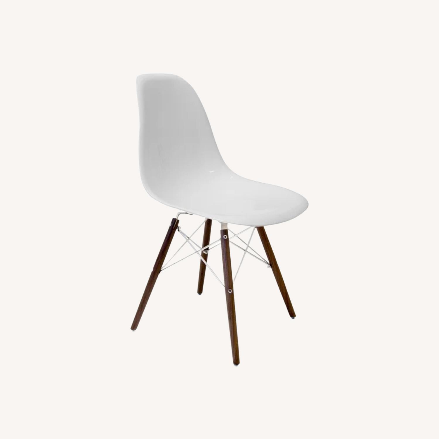 Seller's Notes:Two high-gloss white chairs from Sit Down NY. Front of chairs are glossy, while back of chairs are matte. Easy to wipe down and clean. Walnut legs with chrome finishing. Base is made of natural wood, so there is some variability between the two chairs which I tried to show in the close ups.