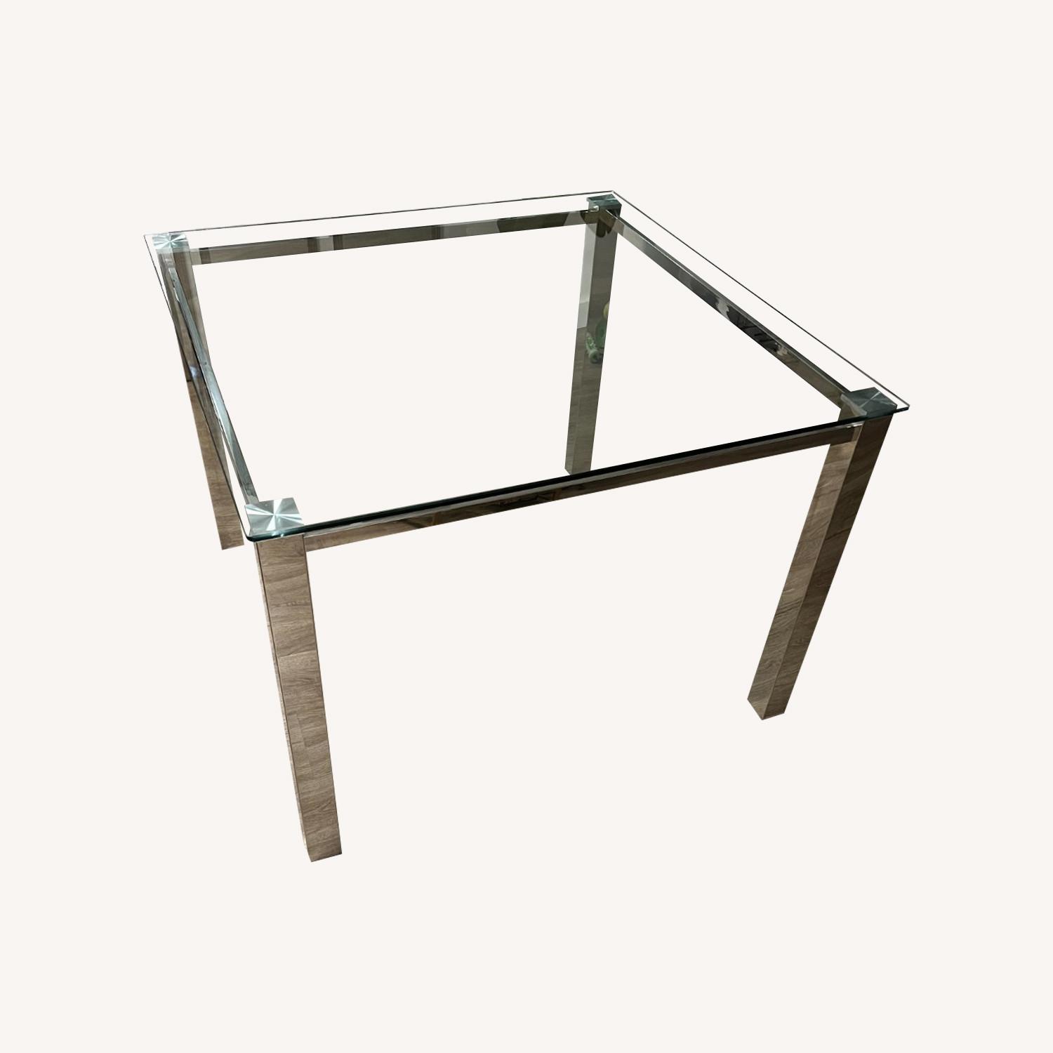 Seller's Notes:Name: Skyline Glass Square Table Purchased 1 Year Ago (Brand New) Glass table with stainless steel legs. Dimensions: 42" Wide x 42" Long x 30" Tall Condition: 9.5/10 No chairs included.