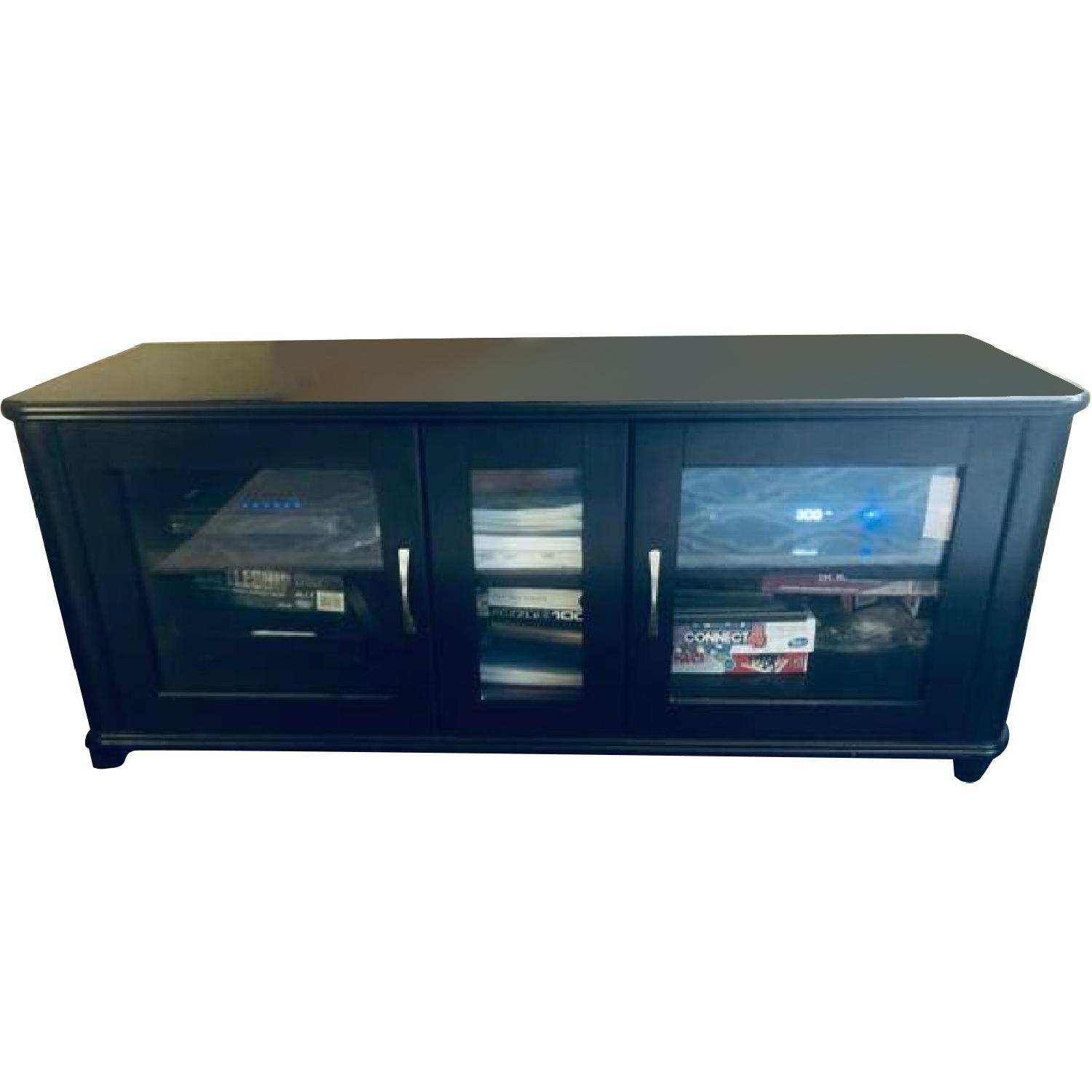 Seller's Notes:This beautiful & sturdy multi-functional TV & Entertainment cabinet in espresso color offers glass-panel front doors, 4 sliding & vented interior shelves, a built-in power strip & removable back panels with open slots for cables. It measures 58"L x 20"W x 25"H. It is in Excellent condition! Must be picked up
