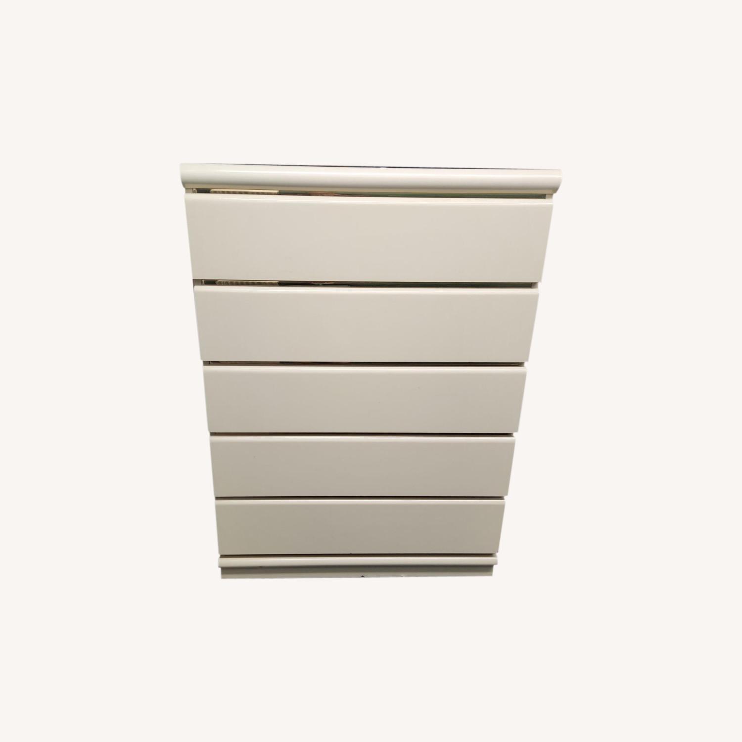 Seller's Notes:There is tons of storage in this handsome, well-appointed chest. It has been in my family for 20 years and held everything from scarves, gloves, underwear, sweaters, and DVDs and batteries in the bottom drawer. It has been very gently used and only has a slight scratch on the top right side. It is sturdy, and its creamy white color and gold accents will warm up any room.