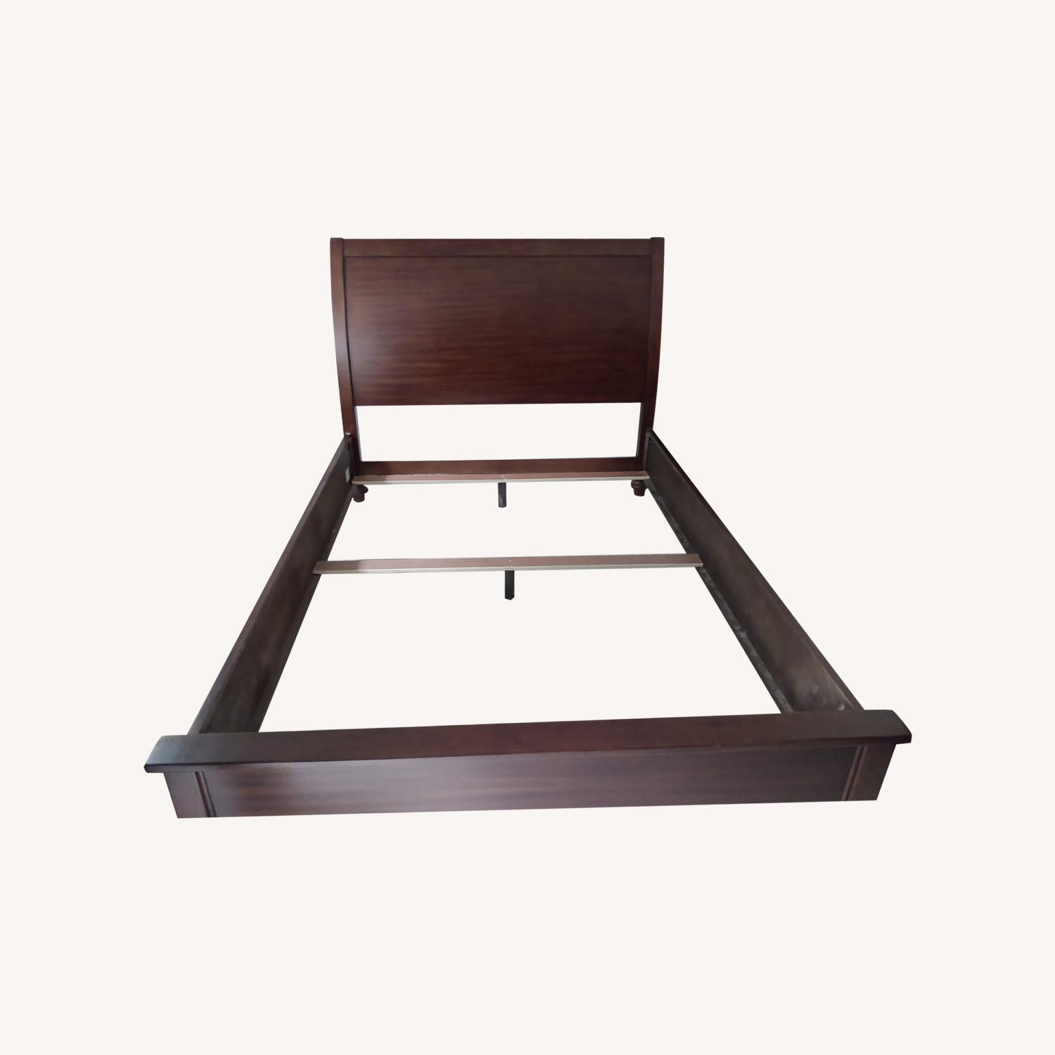 Seller's Notes:One piece of a beautiful five-piece bedroom set, this bed with a sleigh-style headboard is elegant, yet sturdy. The style is versatile, and can be adapted to various design styles including vintage, rustic or contemporary. The wood is a beautiful, dark grain. The box spring and mattress are high quality and great condition, and are included.