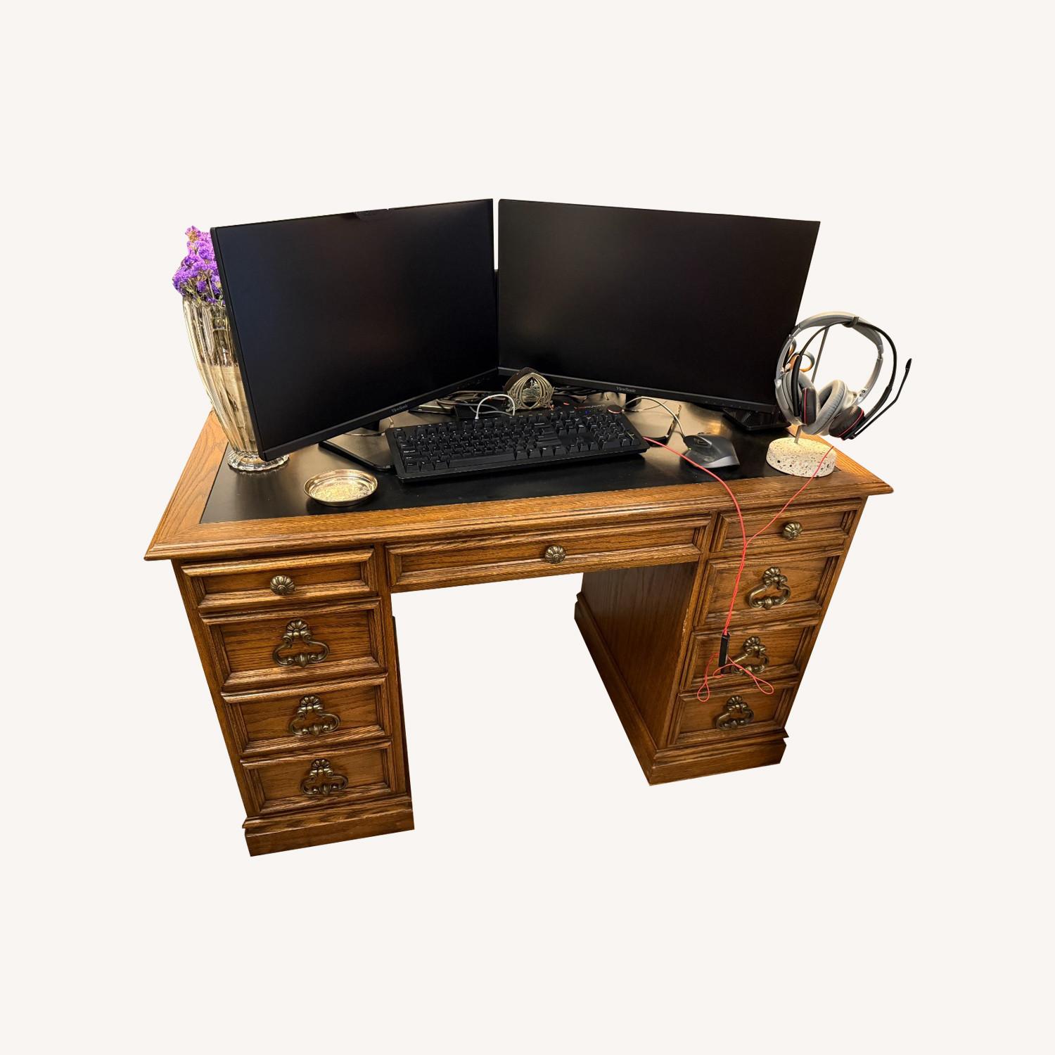 Seller's Notes:Sligh Furniture Executive Desk 46.5" length 23.5" depth 29" height Beautiful executive desk with some noticeable wear consistent with use and age, middle two drawers are joined with the depth of a file cabinet. No issues with drawers and completely stable. Excellent vintage piece. Moving and this desk will not fit my new setup, otherwise I would keep it.