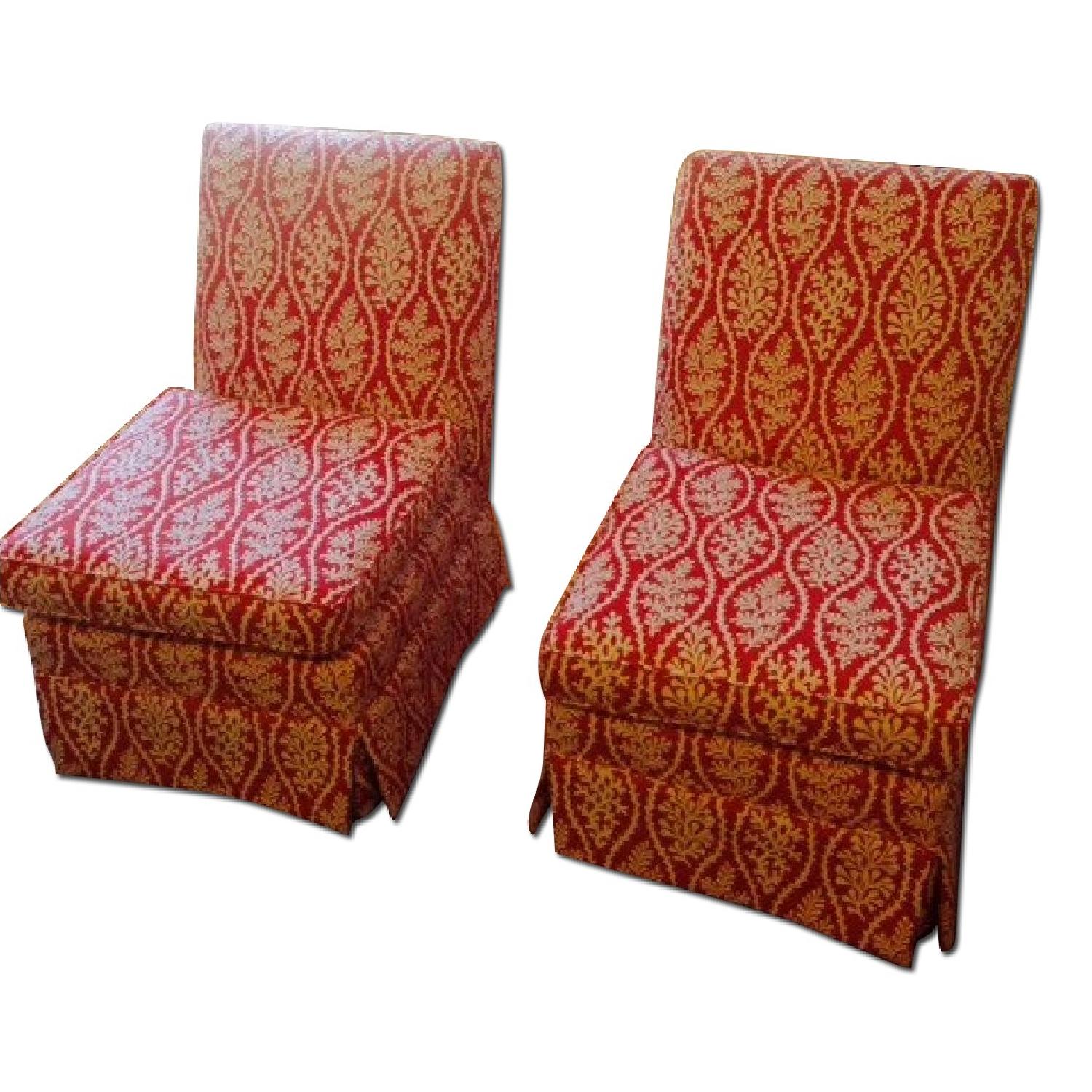 Seller's Notes:Lovely pair of expertly upholstered slipper chairs in gorgeous, quality fabric. These slipper chairs will lend character and class to your living space and will be a great addition to your home.