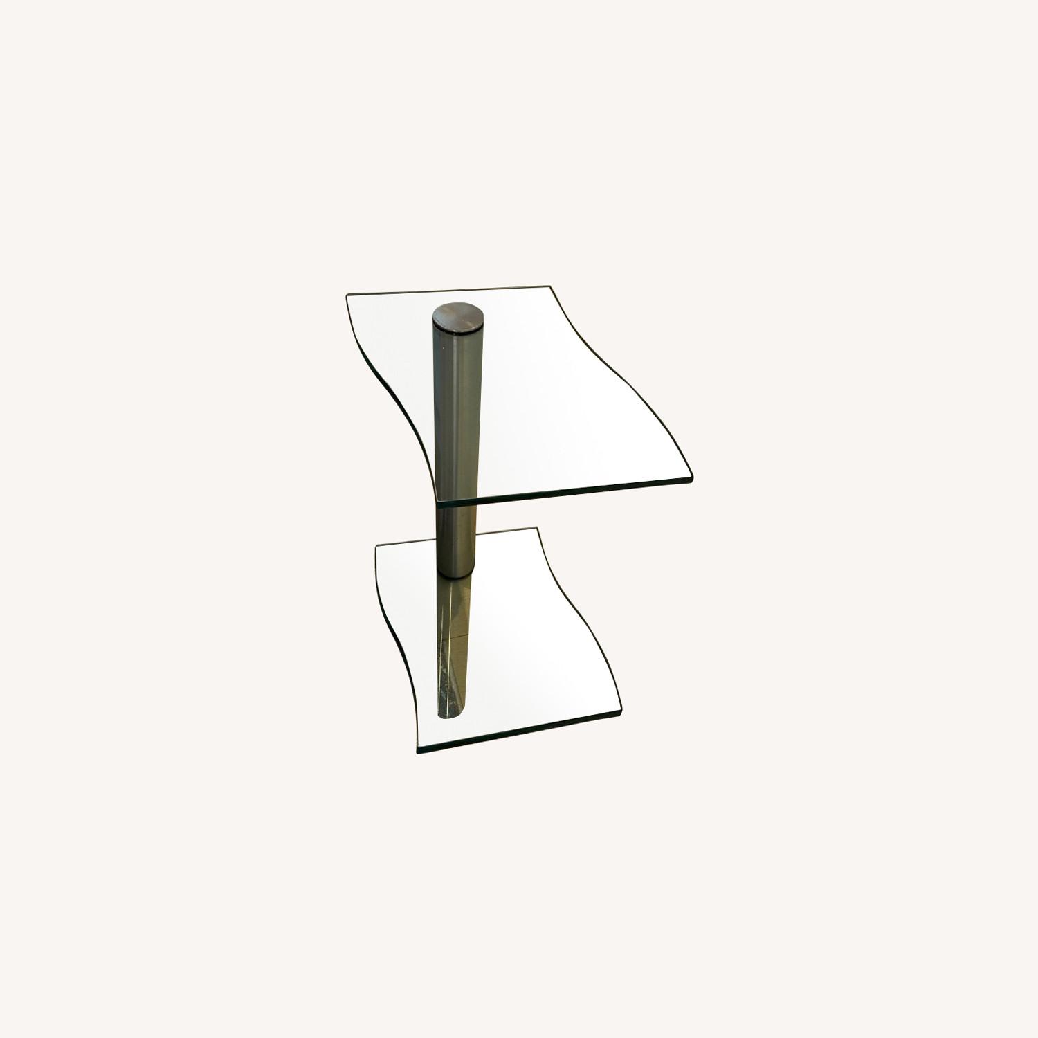 Seller's Notes:Glass top and bottom with off center post connecting the two. Great for small spaces where you still need a side table.
