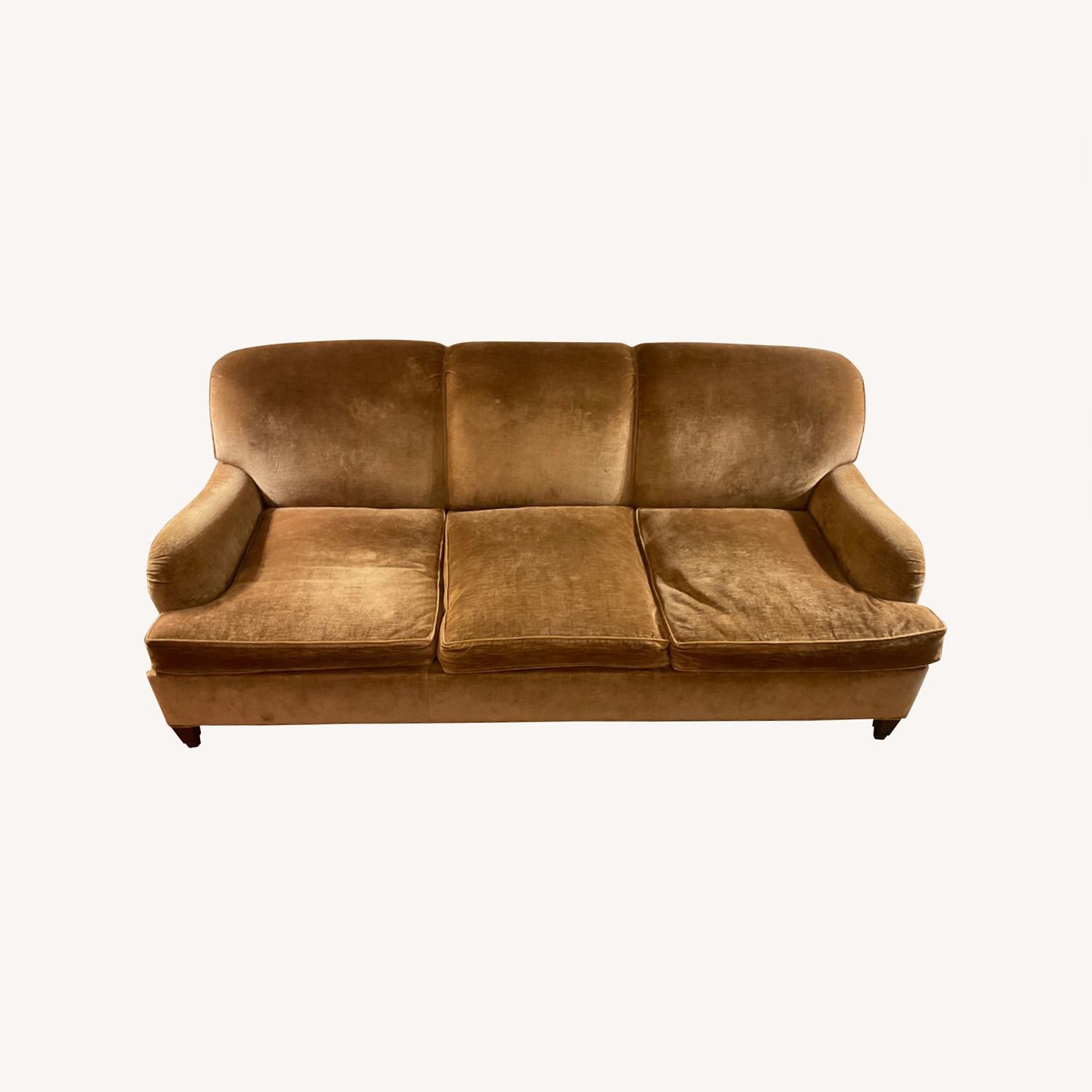 Seller's Notes:Cedar Bridgewater Sofa by Bespoke. Linen velvet toffee colored fabric by Cowtan & Tout; sofa has matching sleeper sofa sold separately, excellent condition. Beautifully coordinating brown animal print ottoman/coffee table with large shagreen tray also listed.