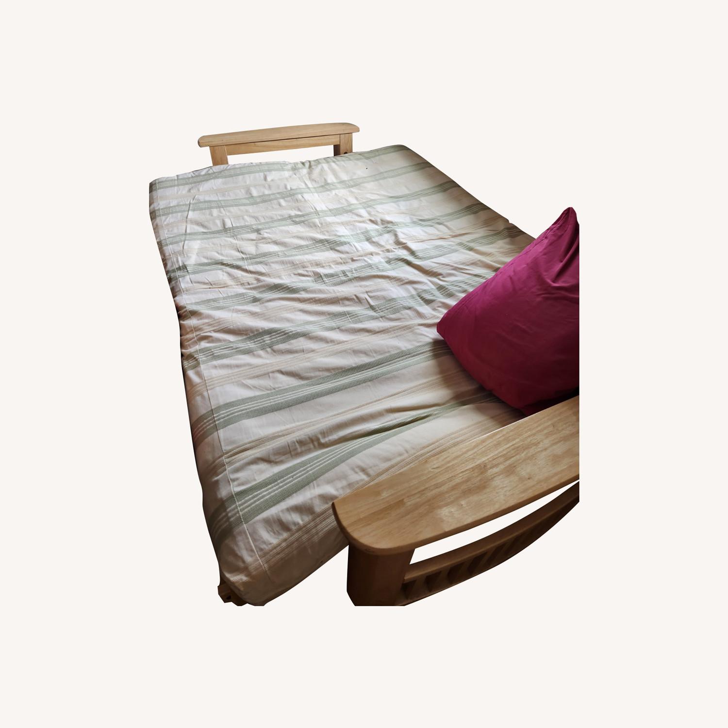 Seller's Notes:Solid maplewood futon. Has storage in both armrests; a simple pull from the middle top makes it a sofa and from the bottom makes it a bed. Comes with firm futon pad