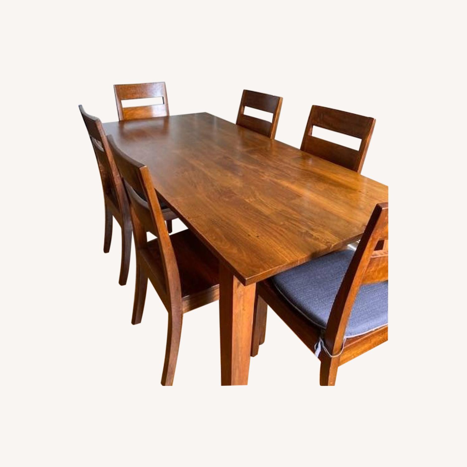 Seller's Notes:Absolutely gorgeous Mango wood table and six solid Mango wood chairs. I have kept the table waxed and polished; the whole set is like new. Comes with comfortable cushions for the chairs. This is a very heavy piece, so need two people to move.