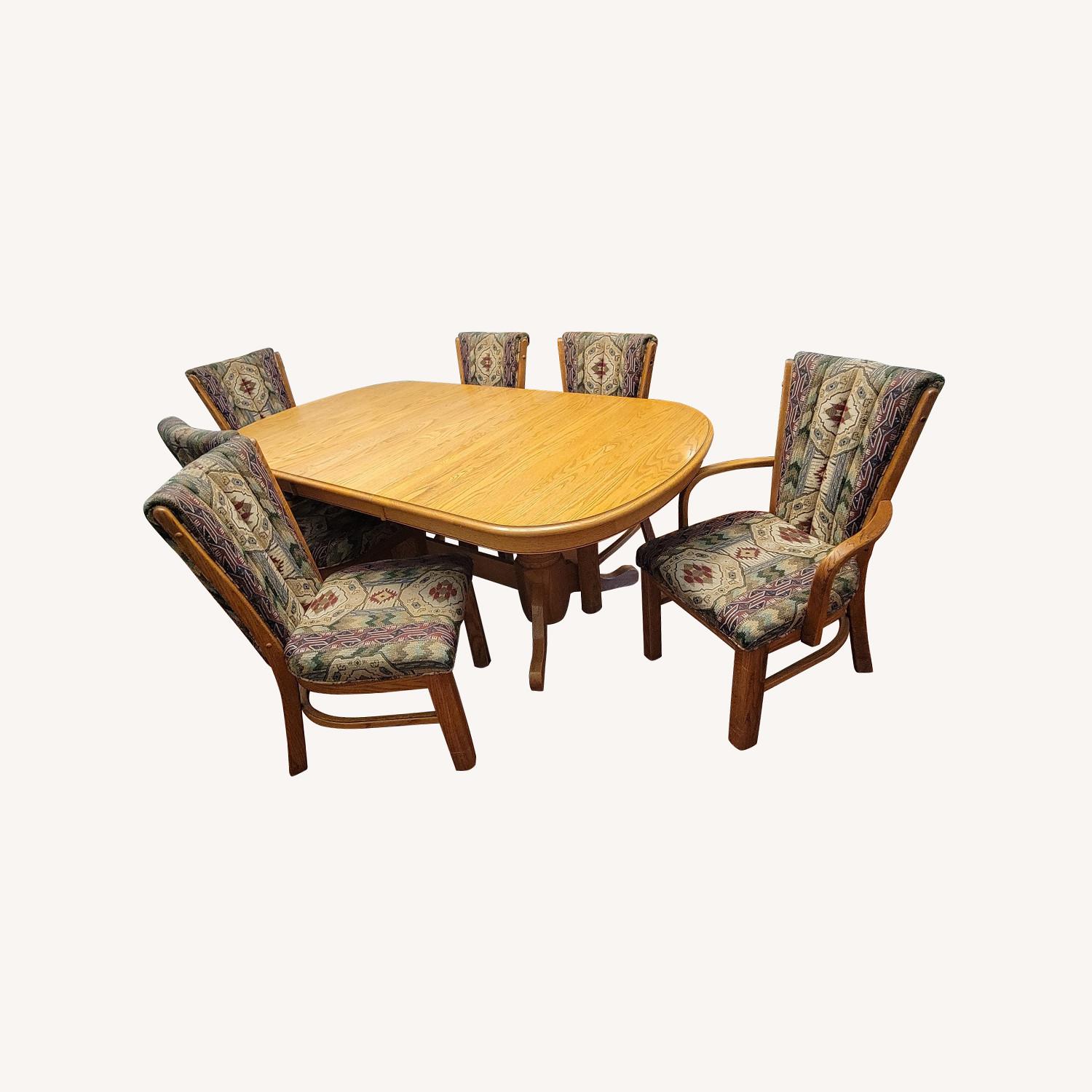 Seller's Notes:This solid oak dining set has served us incredibly well, though it is too large for our new place so we must find it a new home. The oval table comfortably seats six, and has two additionally leaves kept inside the table (a rather ingenious and smoothly-rolling mechanism - see picture!) that make it a total possible length of 96". We have easily fit a dozen people around the largest table size. Even at its longest, the table is solid due to its pedestal construction. The chairs, two of which are armchairs, are heavy and solid, upholstered in a Southwestern-design fabric. NOTE: Our house has occasionally been visited by a relative's dog, but our house has been completely cat-free.