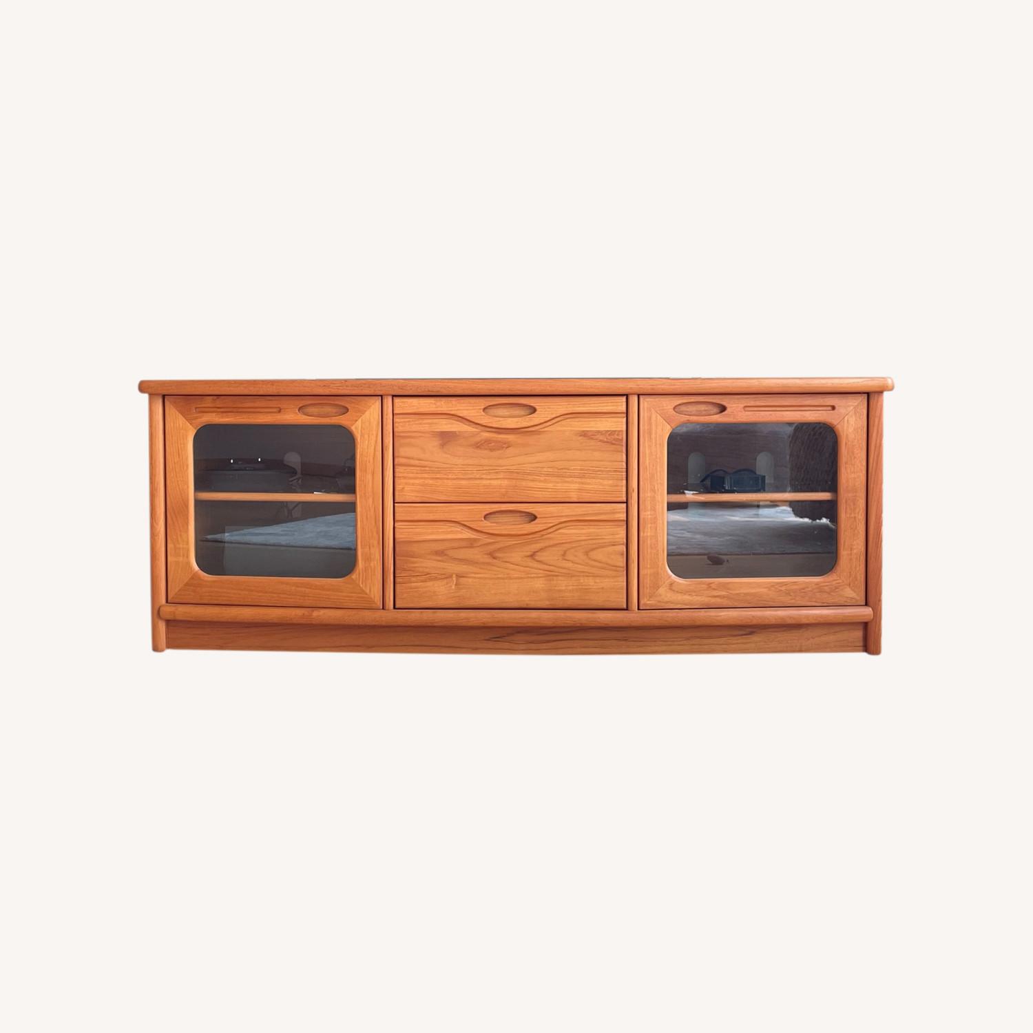 Seller's Notes:Solid, heavy teak TV console with two drawers and two cabinets with adjustable shelves. Cabinets have openings for cords. Magnetic closure on one door is damaged. No damage to any of the wood or glass. Matching bookshelf also available: https://www.aptdeco.com/user/product/view/6644169