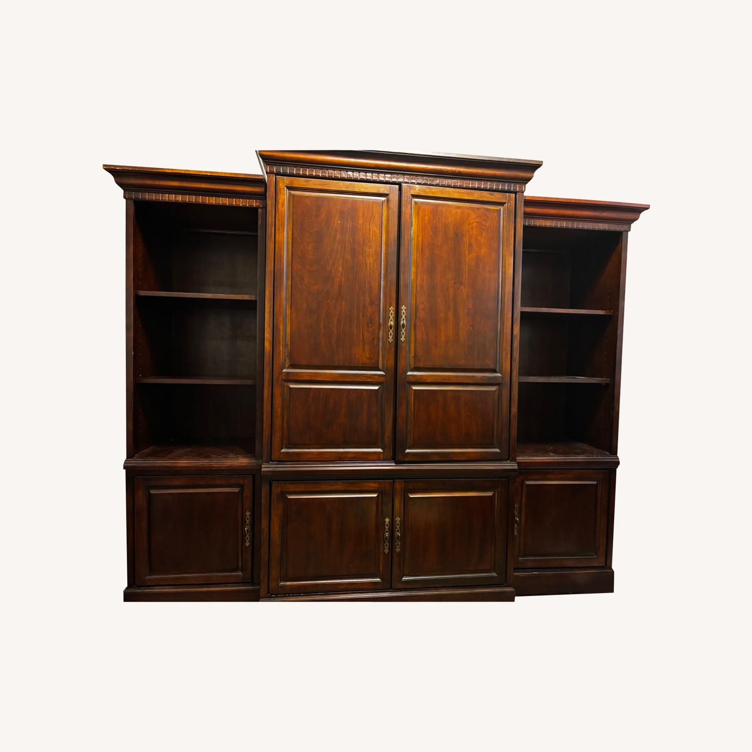 Seller's Notes:This is a solid wood 3 piece  TV armoire/cabinet with plenty of shelving and storage. I’ve had this for about 20 years so there are some scratches, dents, dings, and scuffs on the wood. But it is strong and sturdy and will last a very long time! SELLING FOR $200 OBO. Make me an offer!! I’ve been using it as a sewing station for the past decade and it is perfect for that. Doors tuck in once you open them. Pull-out desk. Comes with all removable and movable shelves. Measurements: 2 side pieces: 6ft tall, 21.5 in wide, 18.5 in deep Middle piece: 6ft 3in tall, 42in wide, 22in deep Can fit a TV 37” wide