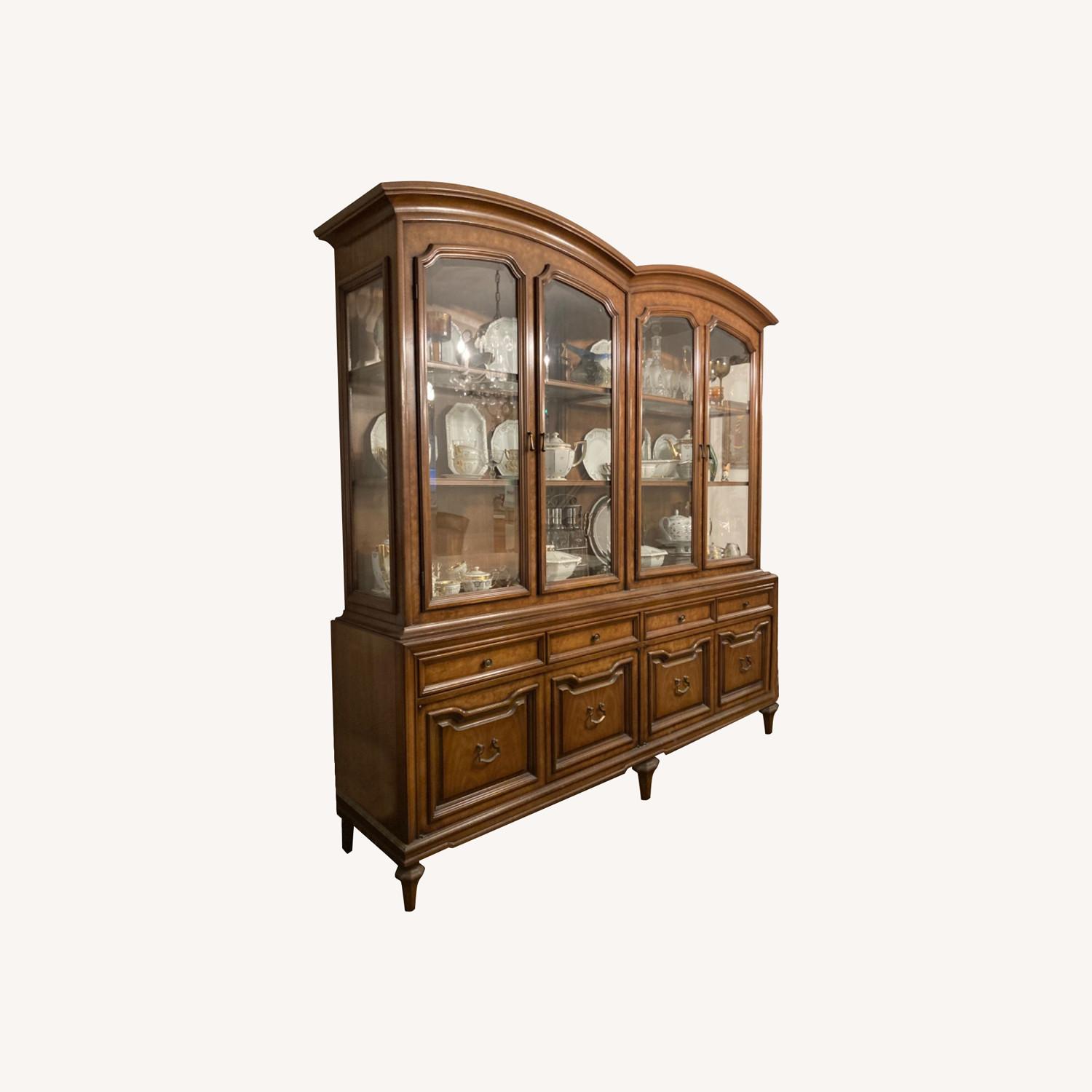 Seller's Notes:This Breakfront is in 2 sections. The upper section, behind the four beveled glass doors hold wood framed glass shelves. There is also a light inside to highlight it’s contents.The lower section has a row of drawers and 2 cabinets: one with shelves, the other with two pullout drawers. This breakfront is from the Hellam Furniture Company, an early twentieth century company located in Pennsylvania.
