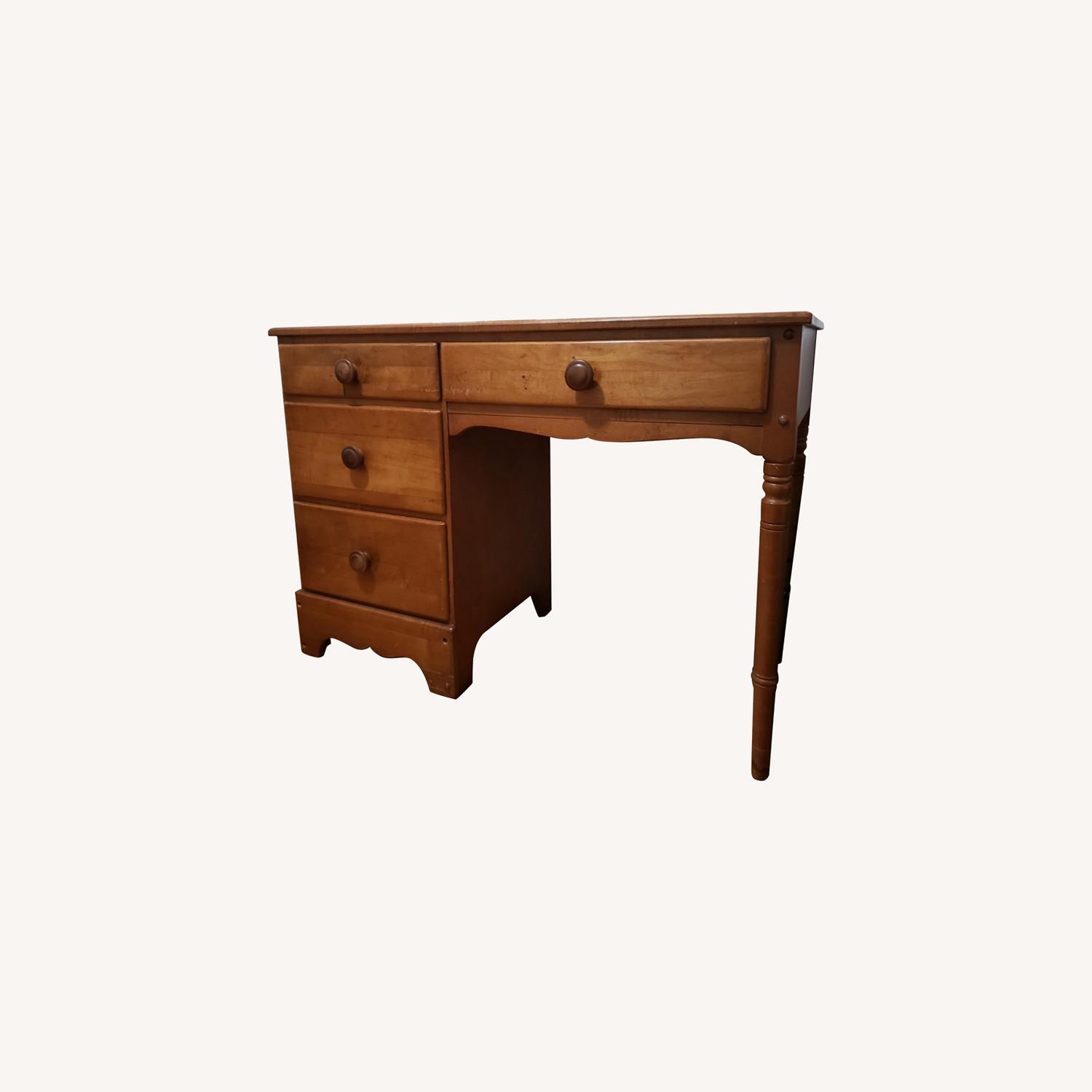 Seller's Notes:This classic desk would be a great addition to any home office space! It features elegant carving on the legs as well as the bottom and each side. The knobs are also wooden but can be changed out for others if you prefer. There are three sizeable drawers on the side with one wide drawer in the middle of the desk.
