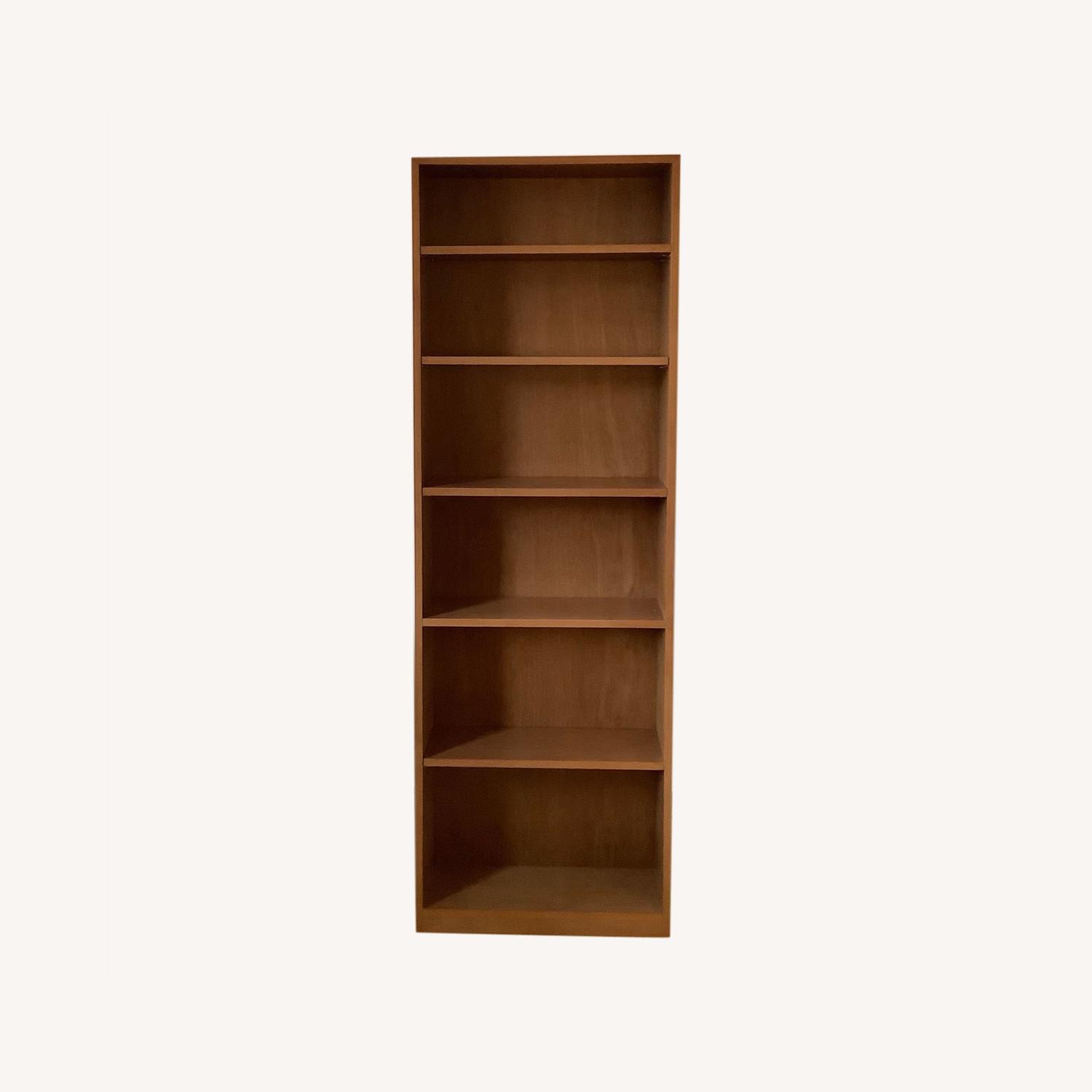 Seller's Notes:Slim solid wood bookcase, teak stain. 5 adjustable shelves. the bookcase is only 9” deep and is perfect for small spaces. There’s a small scratch on one side, but otherwise in excellent condition.