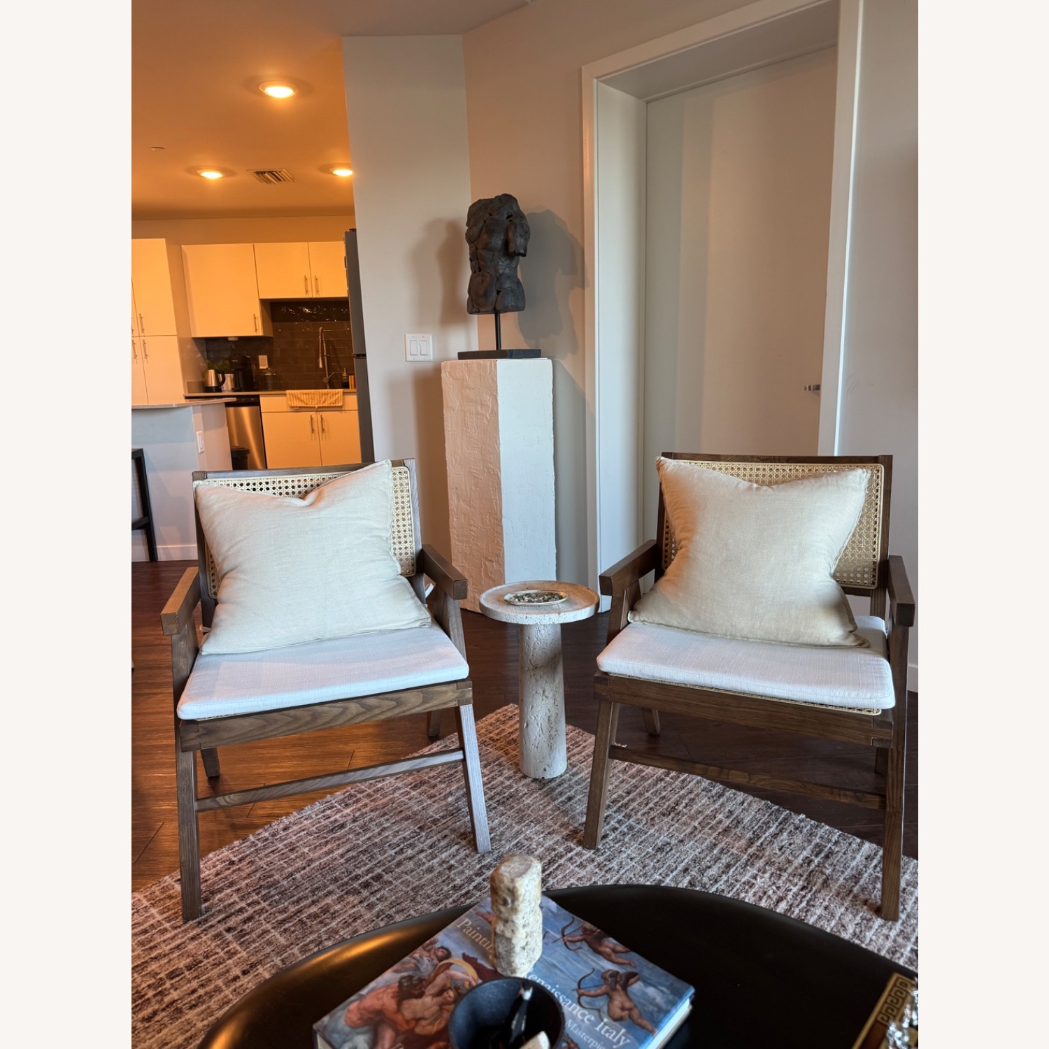 Seller's Notes:Beautiful pair of solid wood lounge chairs with woven cane backs and neutral cushions. Warm wood tones, clean architectural lines, and timeless design that works in both modern and classic spaces. Sturdy, comfortable, and thoughtfully made—these feel elevated and designer-level, not mass-produced. Perfect for a living room, reading nook, or bedroom seating area. • Sold as a set of two • Solid wood frames • Natural cane backs • Neutral, removable cushions • Excellent condition Stylish, versatile, and ready to elevate any space.