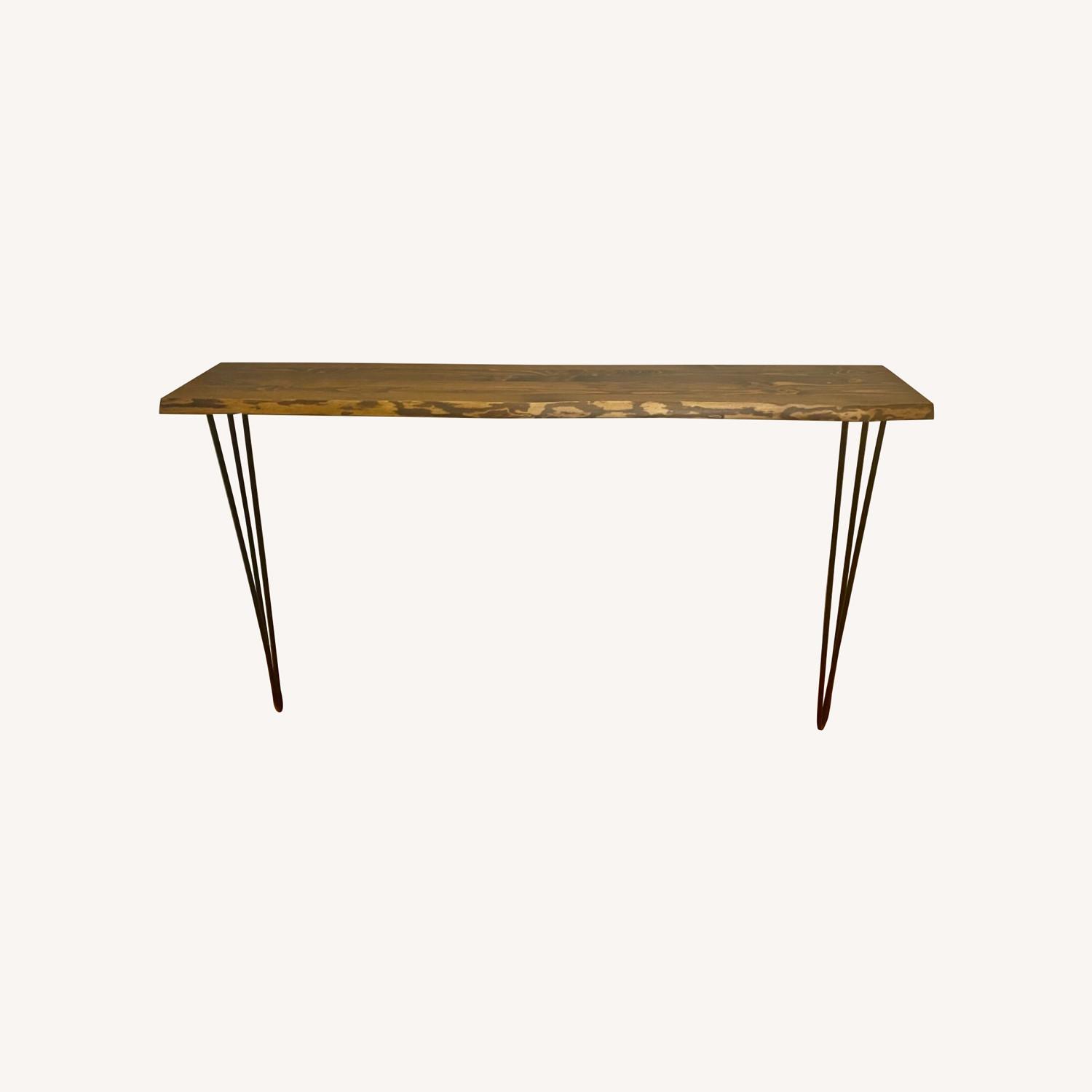 Seller's Notes:58x9x36 Solid wood raw edge console table with iron legs. Beautiful stain with grain showing through, completely smooth finish. Hand made. Purchased last year, no signs of wear. Moving and must sell everything. Great height to use as bar for dining too