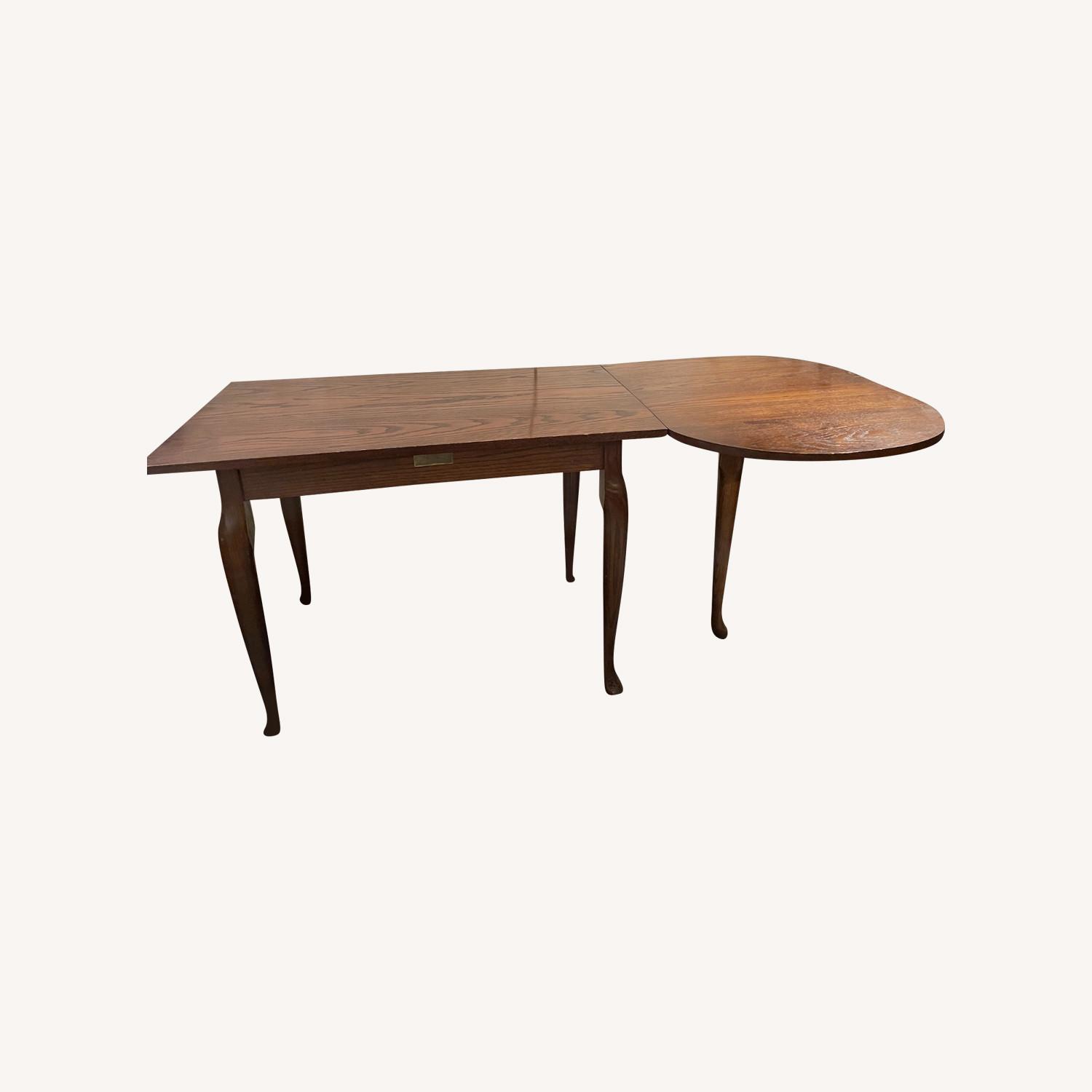 Seller's Notes:This vintage solid wood (oak, I think) desk was custom made and expands from 38" to 62" with a folding leaf. Wood is beautiful stained and shows off the amazing natural grain. The main section of the desk is 22" deep and the expansion leaf is 29" deep. It is in great condition with only some light wear and tear along the edge (see pics).