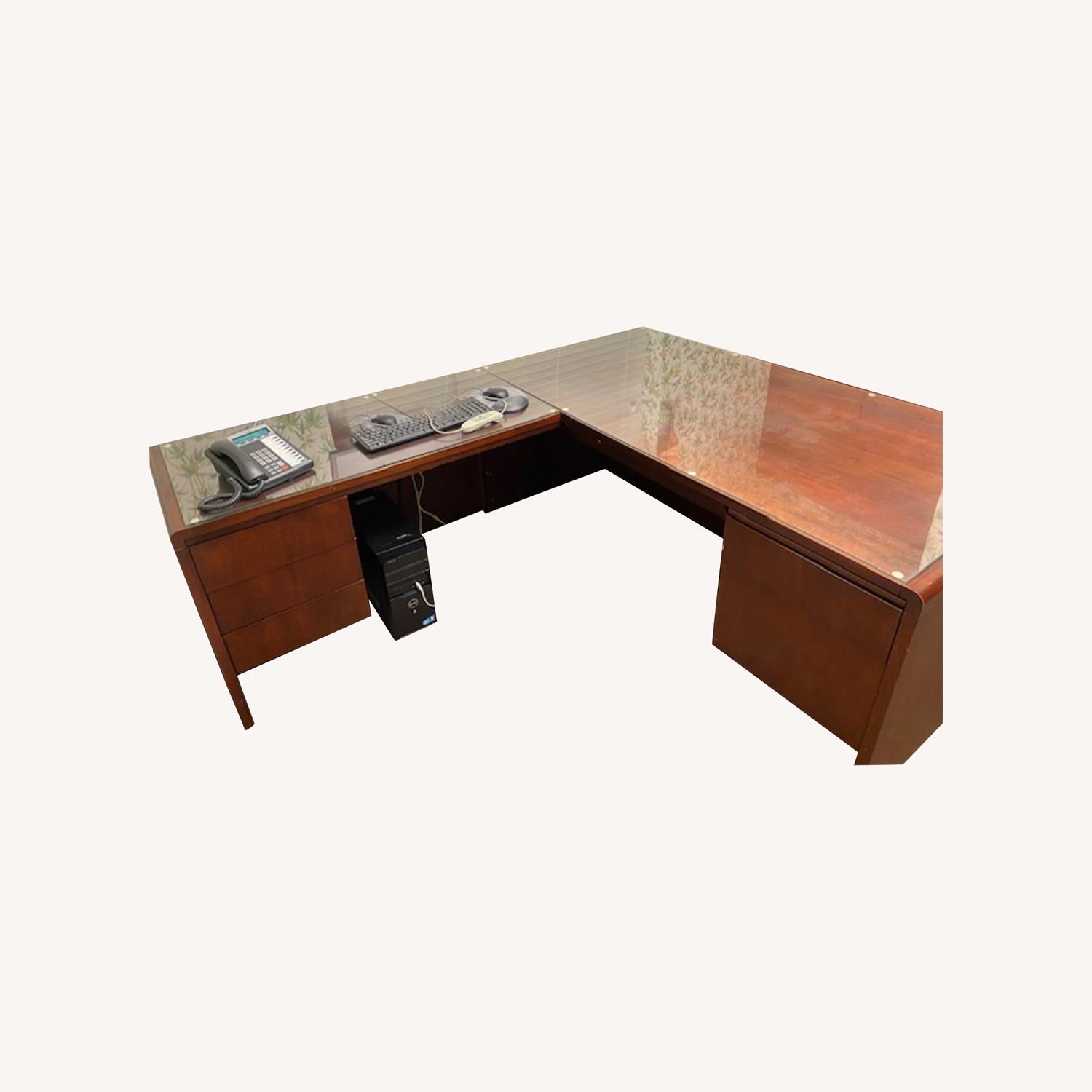 Seller's Notes:Solid wood desk with custom made detachable glass top -with locking file drawer and second top draw. Also has non-locking pencil drawer. Detachable side arm with 3 locking drawers. Wood in good condition as has had glass topper on both pieces the entire time. Lock and key fit all locks. We are a small office that moved this desk from another location. In good condition.