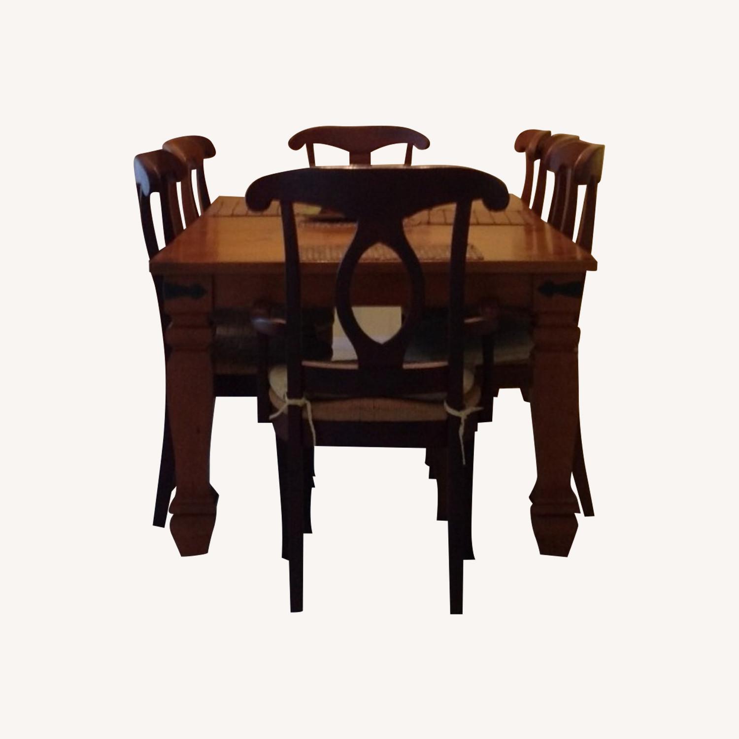 Seller's Notes:Well loved by family of three - Designed with a thick plank top and bold baluster posts, and crafted of solid wood, this table has a french country charm. Worn and warm character, many years of life left!